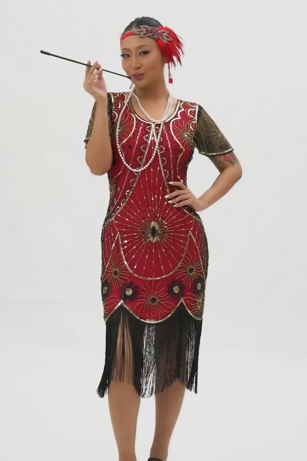Gatsby Black Red Scoop Fringed Bodycon1920s Dress with Sequins