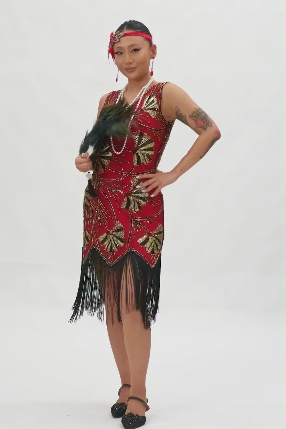 Red Golden Sequin 1920s V Neck Bodycon Flapper Dress with Tassles