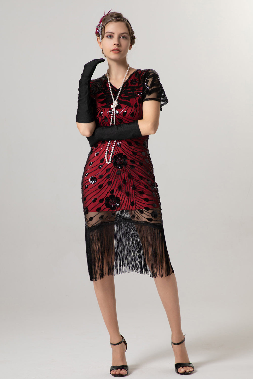 Sparkly Black Golden Fringed V Neck 1920s Dress with Short Sleeves