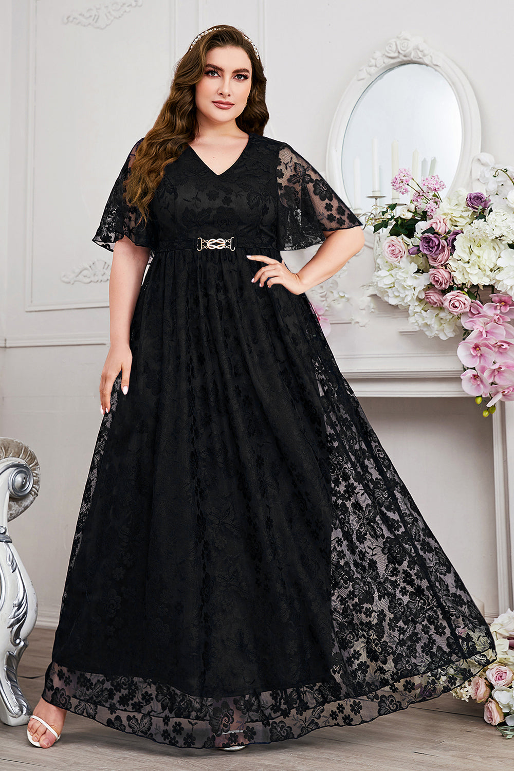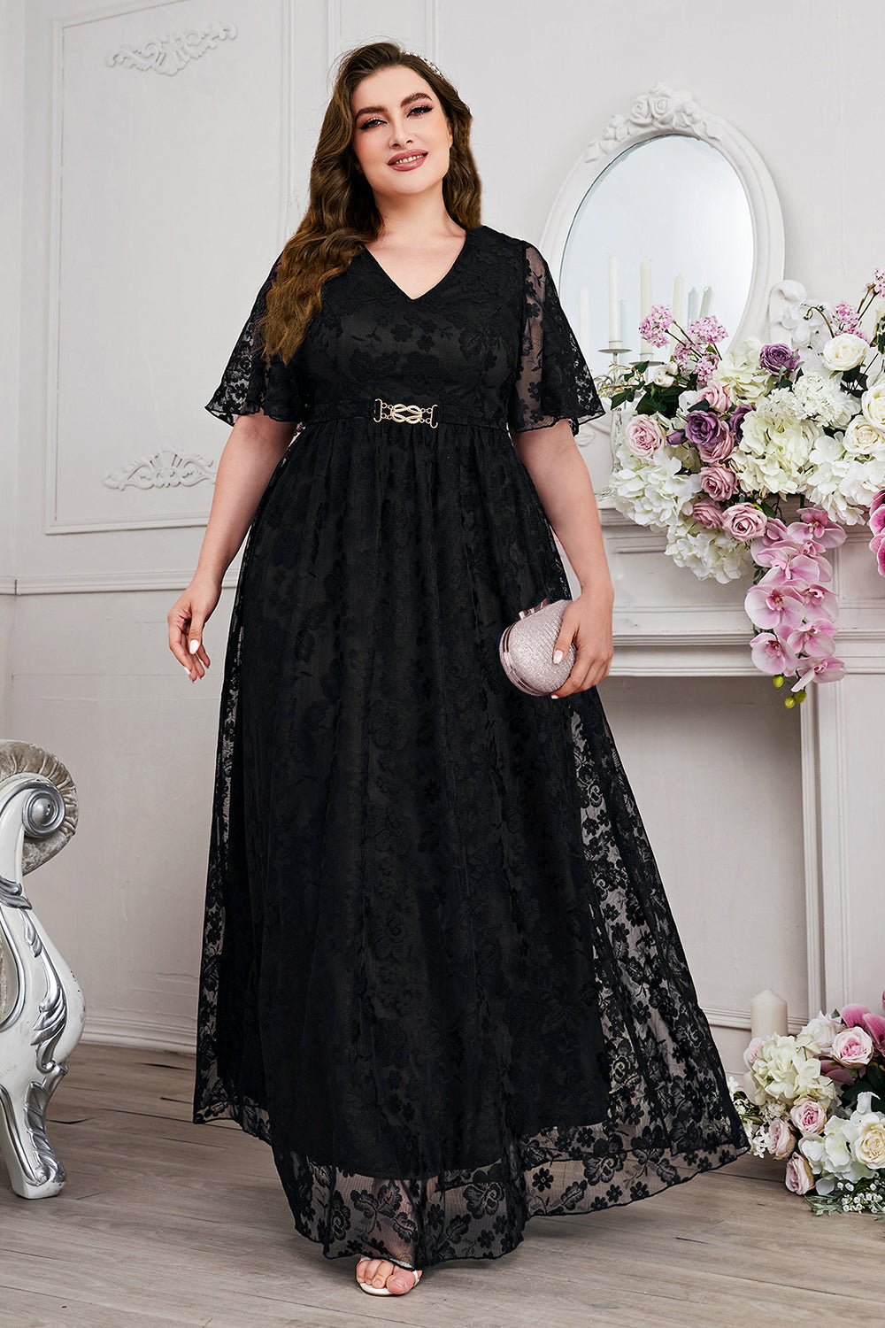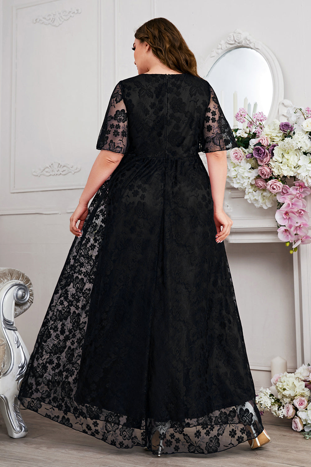 Navy A-Line Lace V-Neck Short Sleeves Long Mother of the Bride Dress