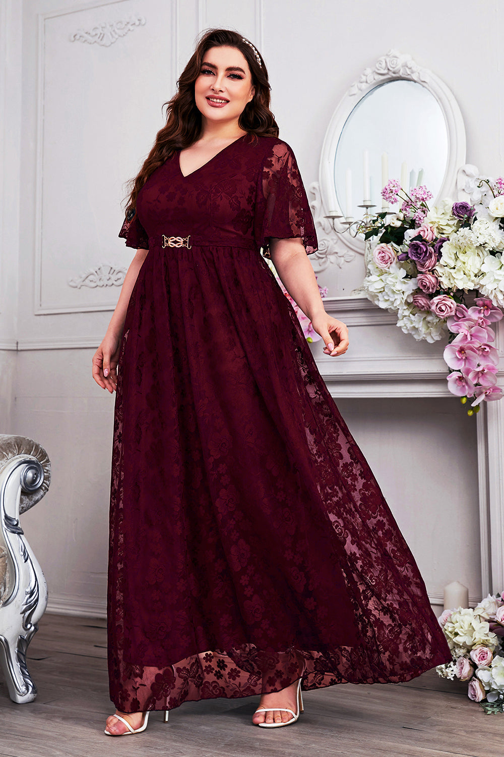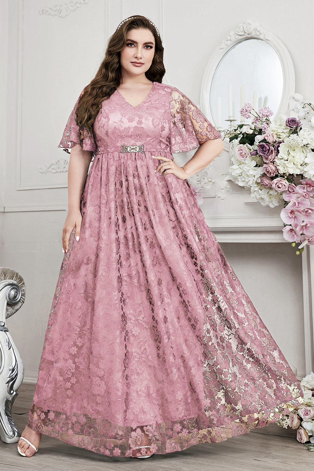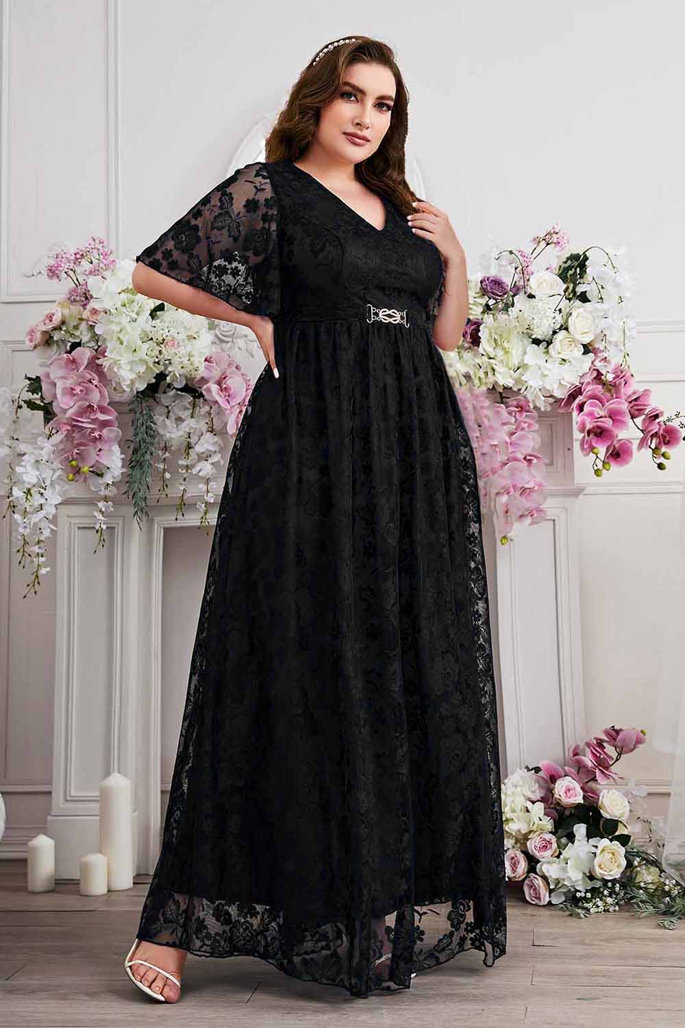 Navy A-Line Lace V-Neck Short Sleeves Long Mother of the Bride Dress