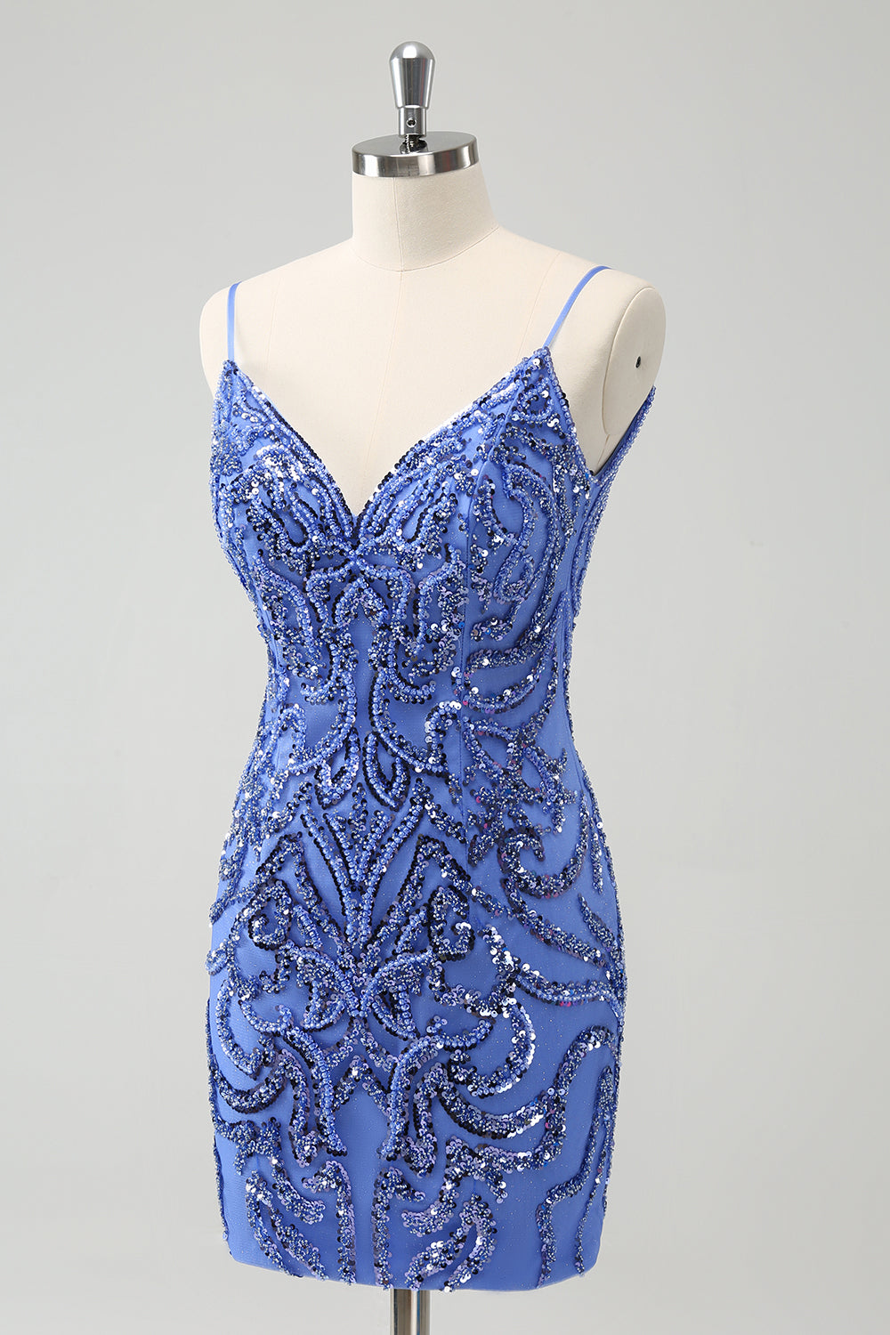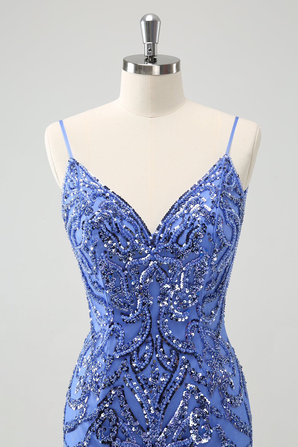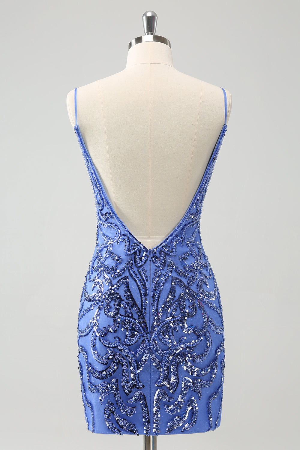 Blue Backless Spaghetti Straps Tight Graduation Dress with Sequins