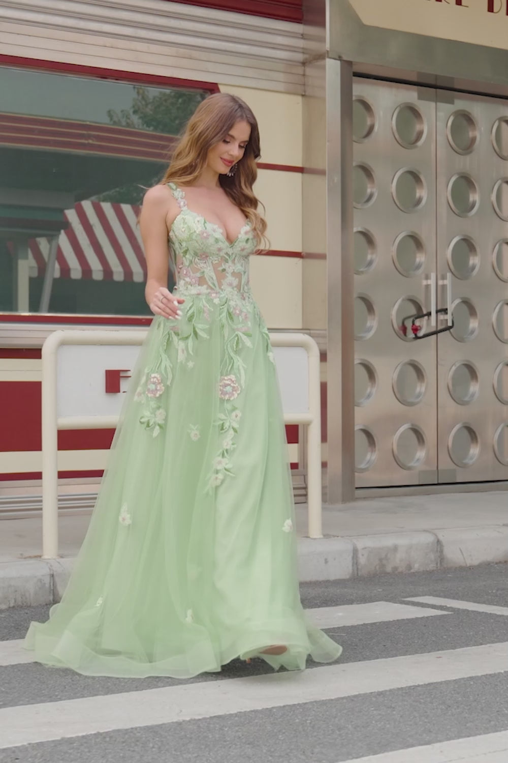 Green A line Spaghetti Straps Appliqued Corset Long Prom Dress With Tulle