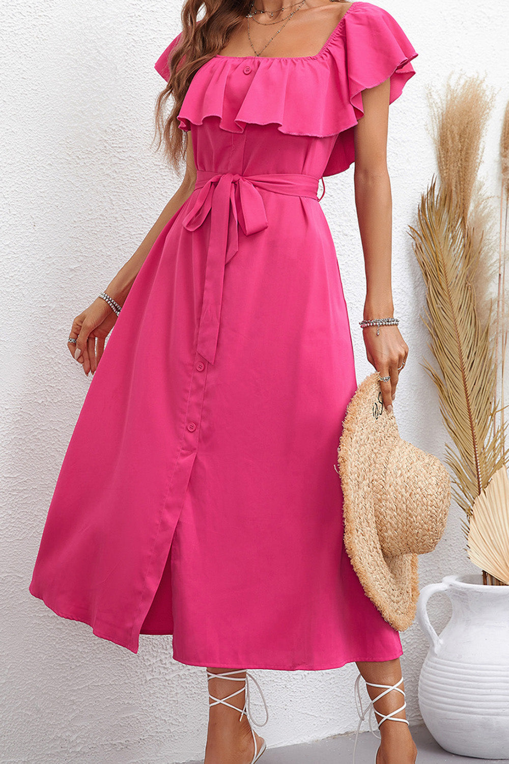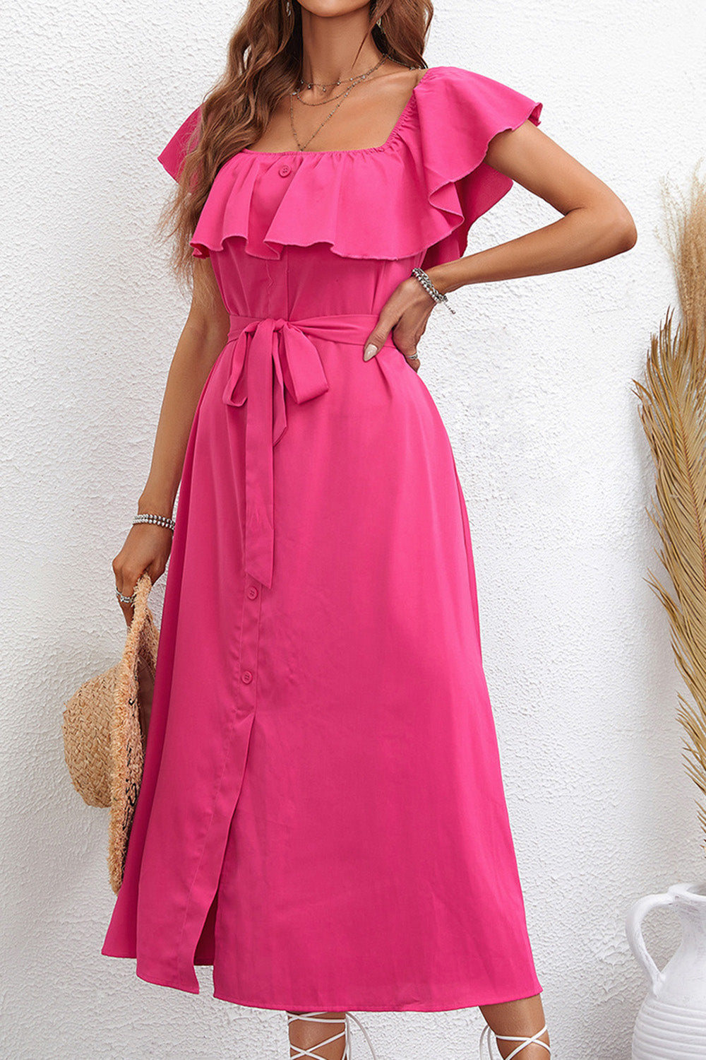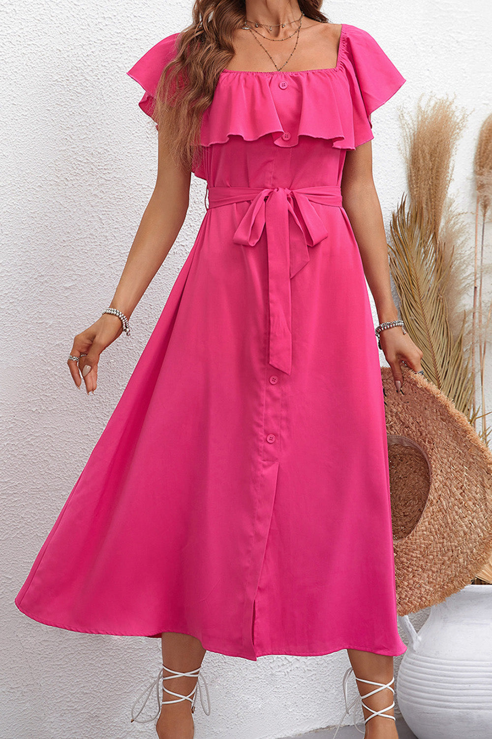 Hot Pink Square Neck Ruffled Summer Dress