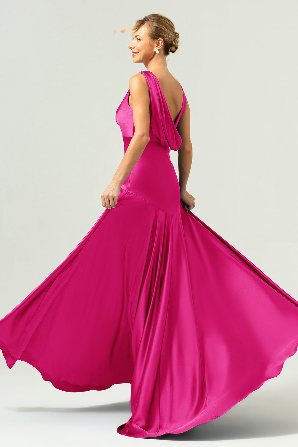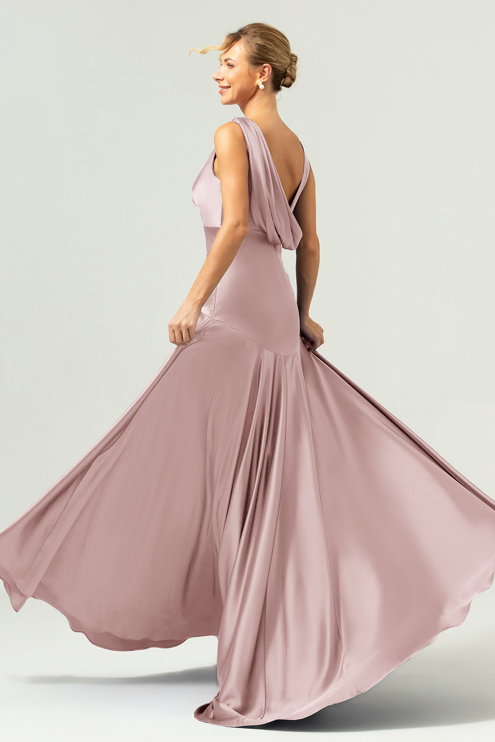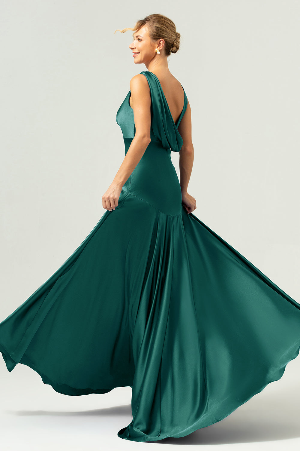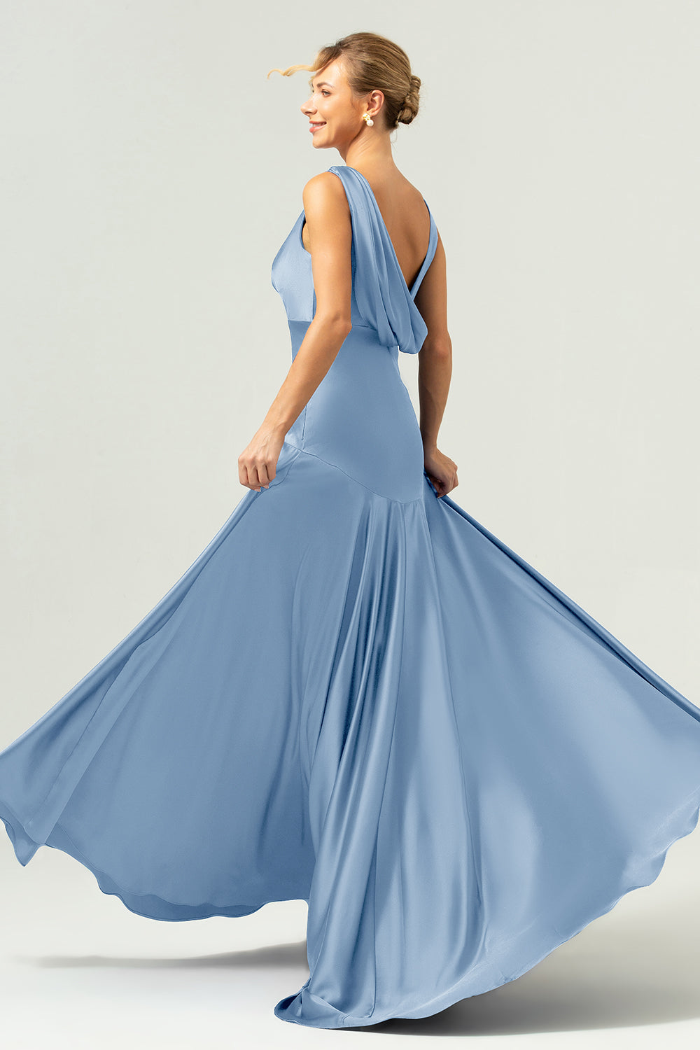 Blue Asymmetrical Cowl Neck Satin Bridesmaid Dress with Slit