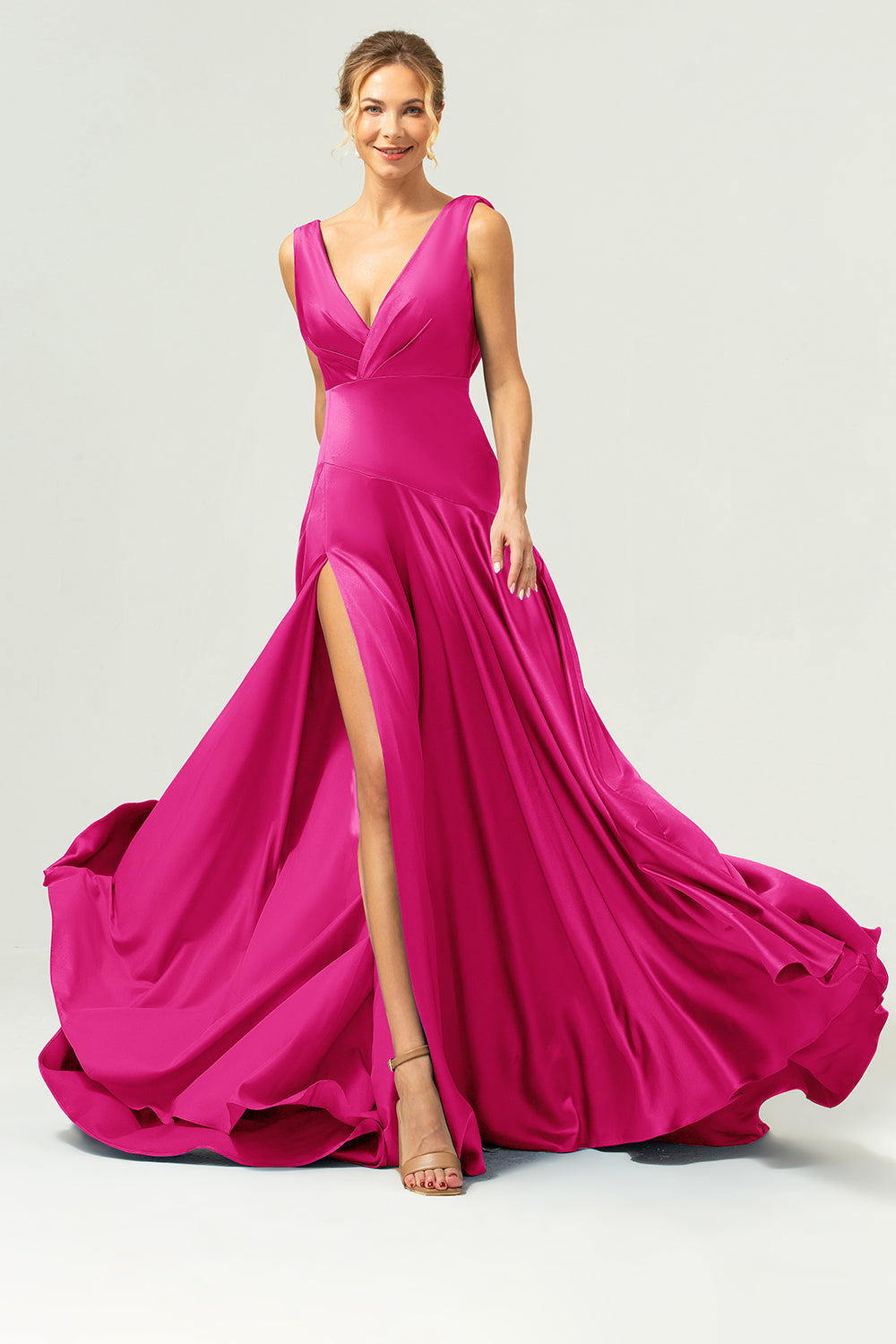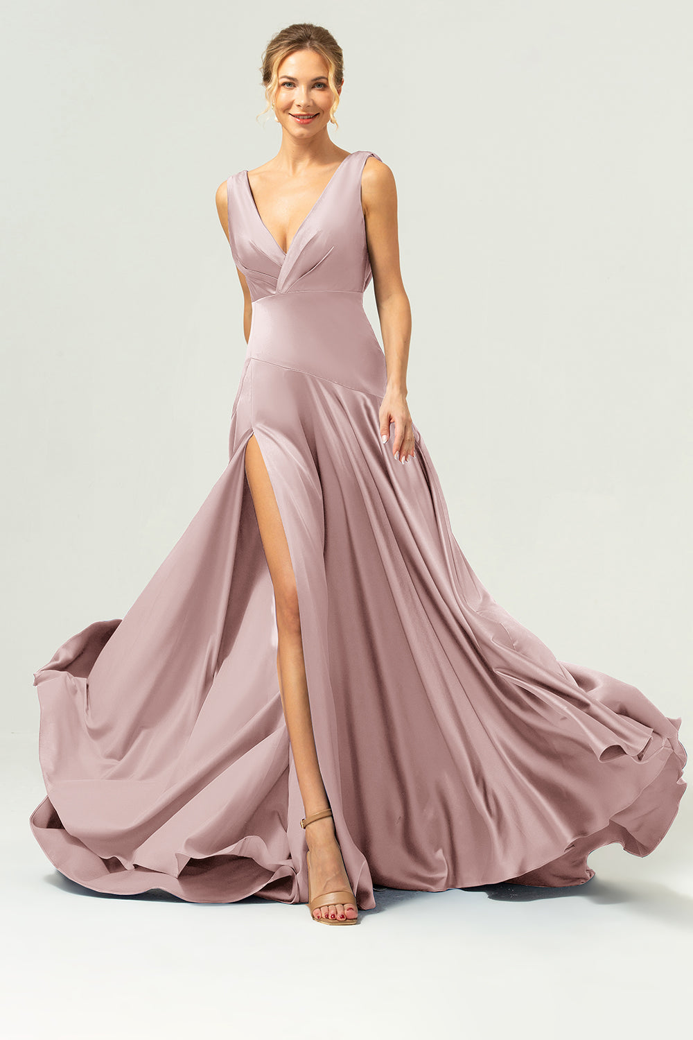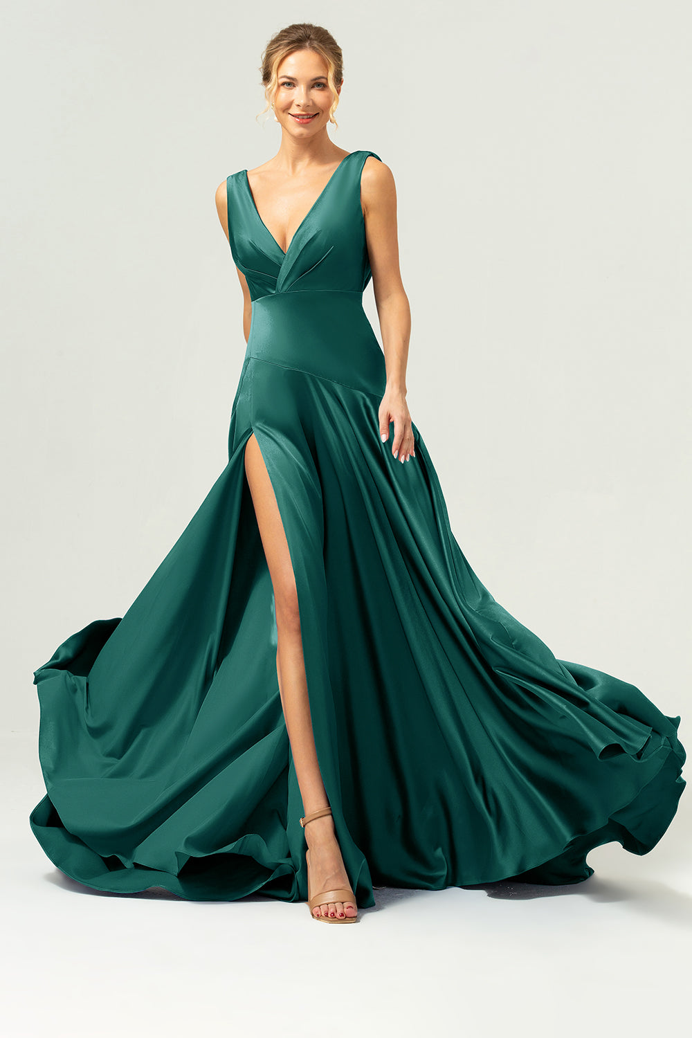 Ink Blue A Line V-Neck Satin Long Bridesmaid Dress with Slit