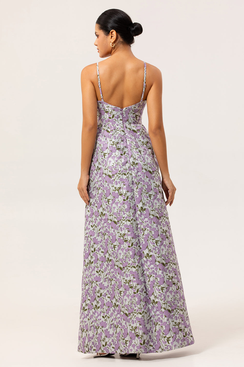 Purple Floral A Line Printed Spaghetti Straps Wedding Guest Dress