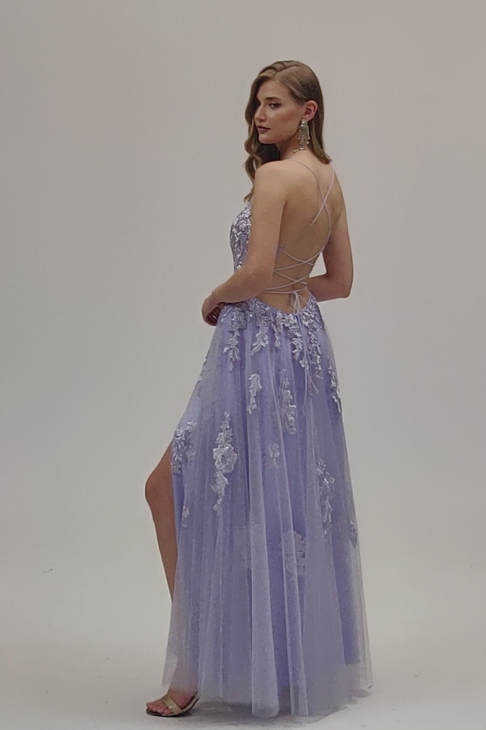Lavender Spaghetti Straps Appliques Long Prom Dress with Slit