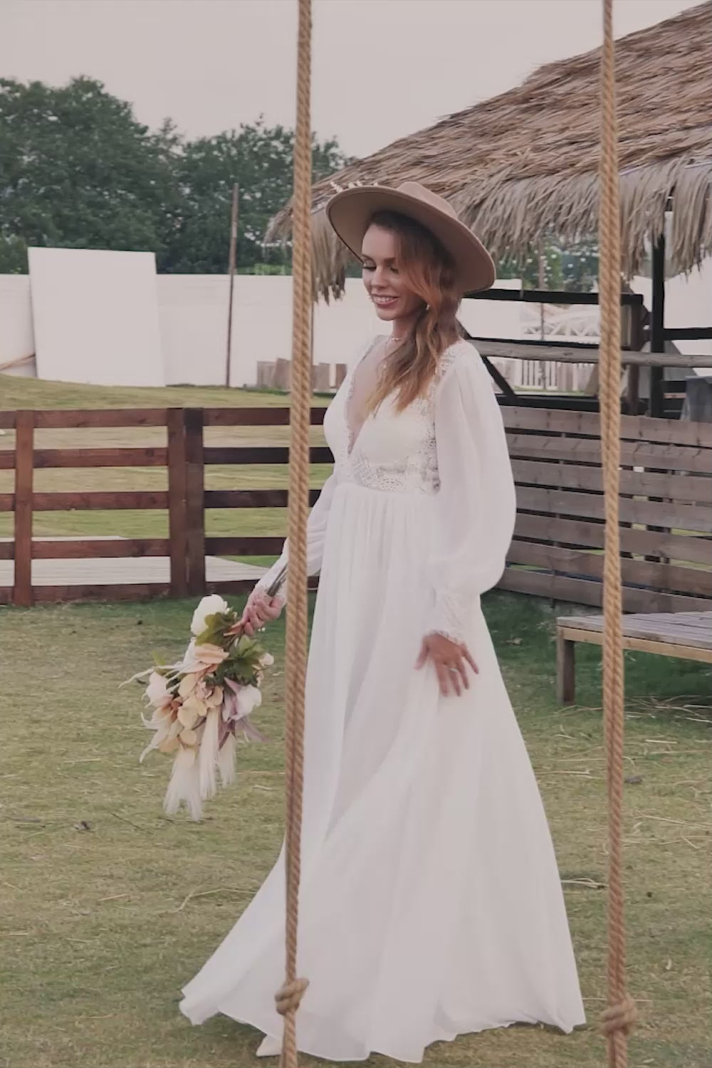 Ivory Lace Chiffon V-Neck Long Sleeve Boho Wedding Dress