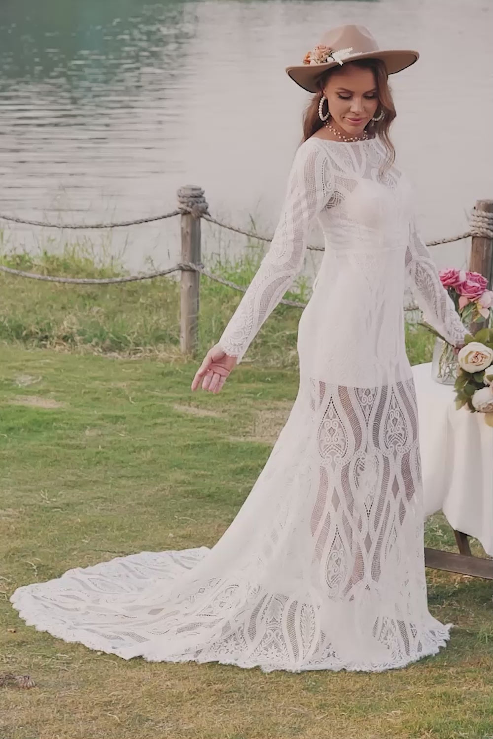 Ivory Mermaid Long Sleeves Lace Boho Wedding Dress With Sweep Train