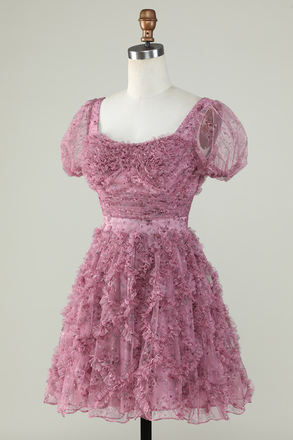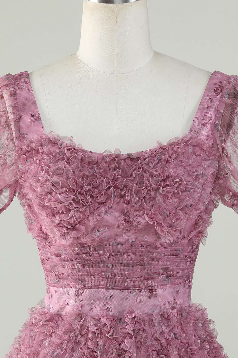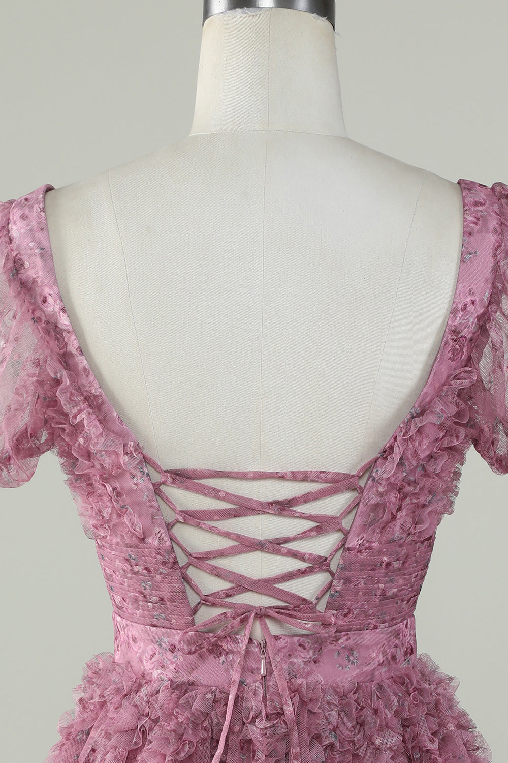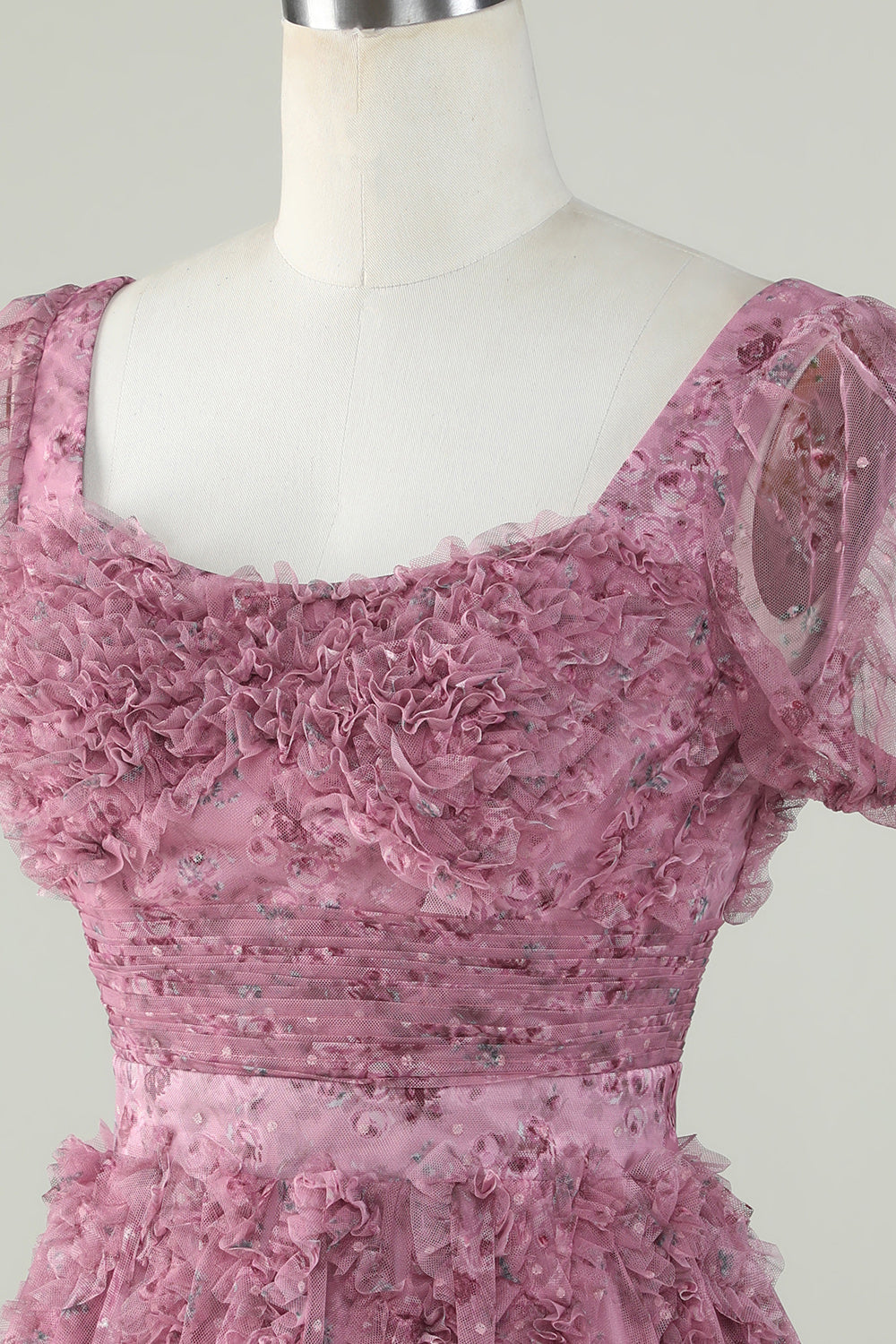 Gorgeous A Line Floral Dusty Rose Graduation Dress with Ruffles