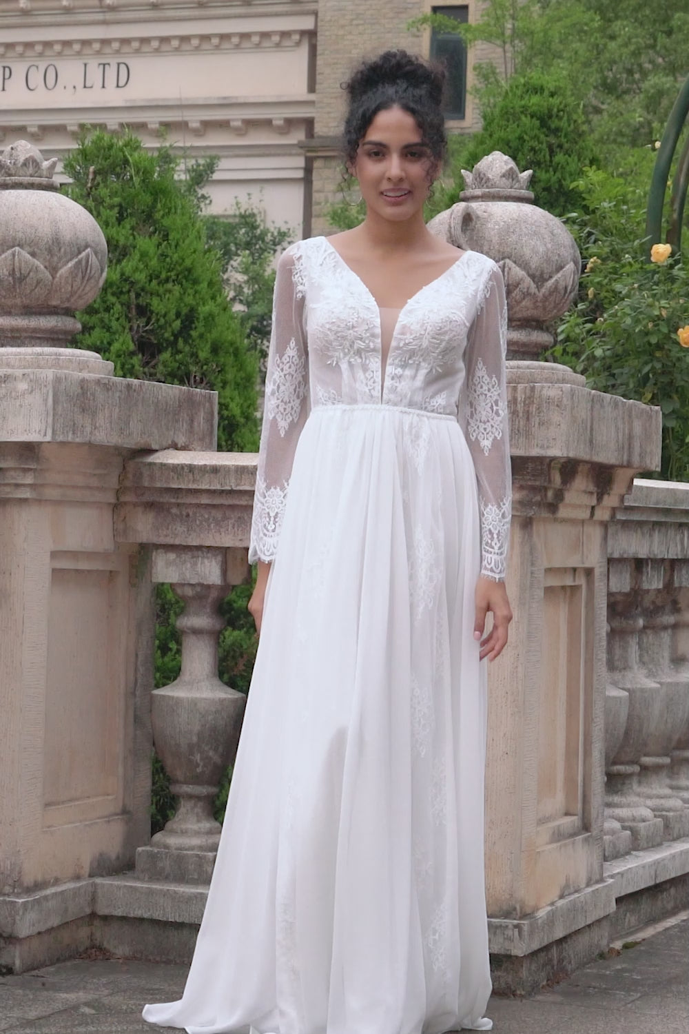 A Line V Neck Long Sleeve Beach Boho Wedding Dress with Lace Appliqued