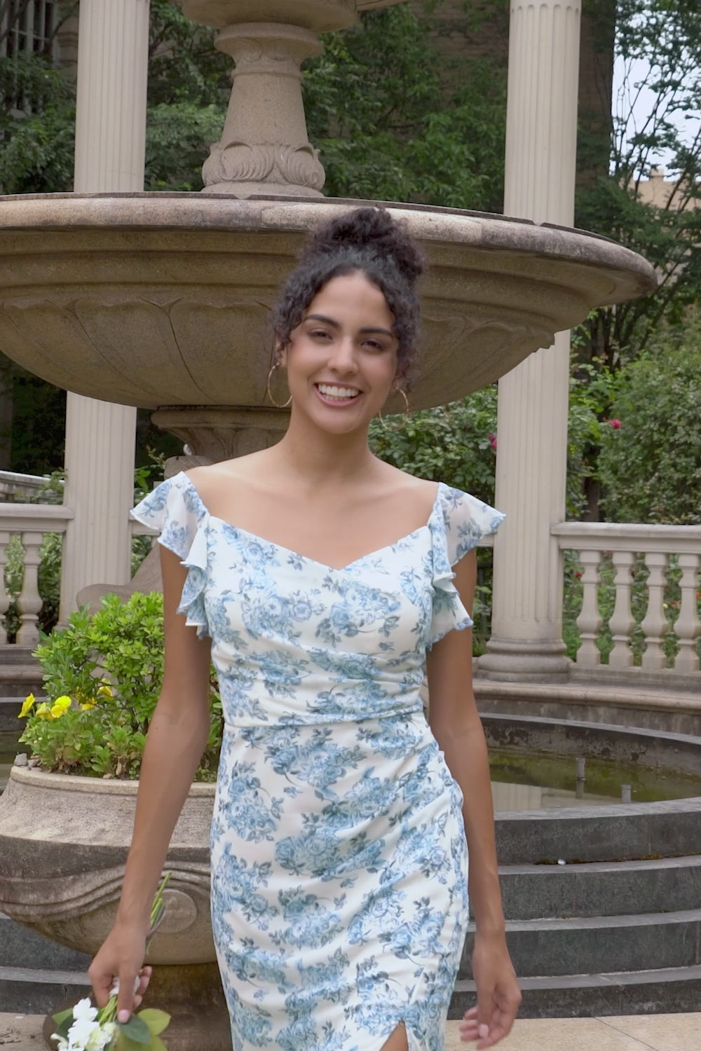 Blue Floral A Line Ruffles Asymmetrical Wedding Guest Dress