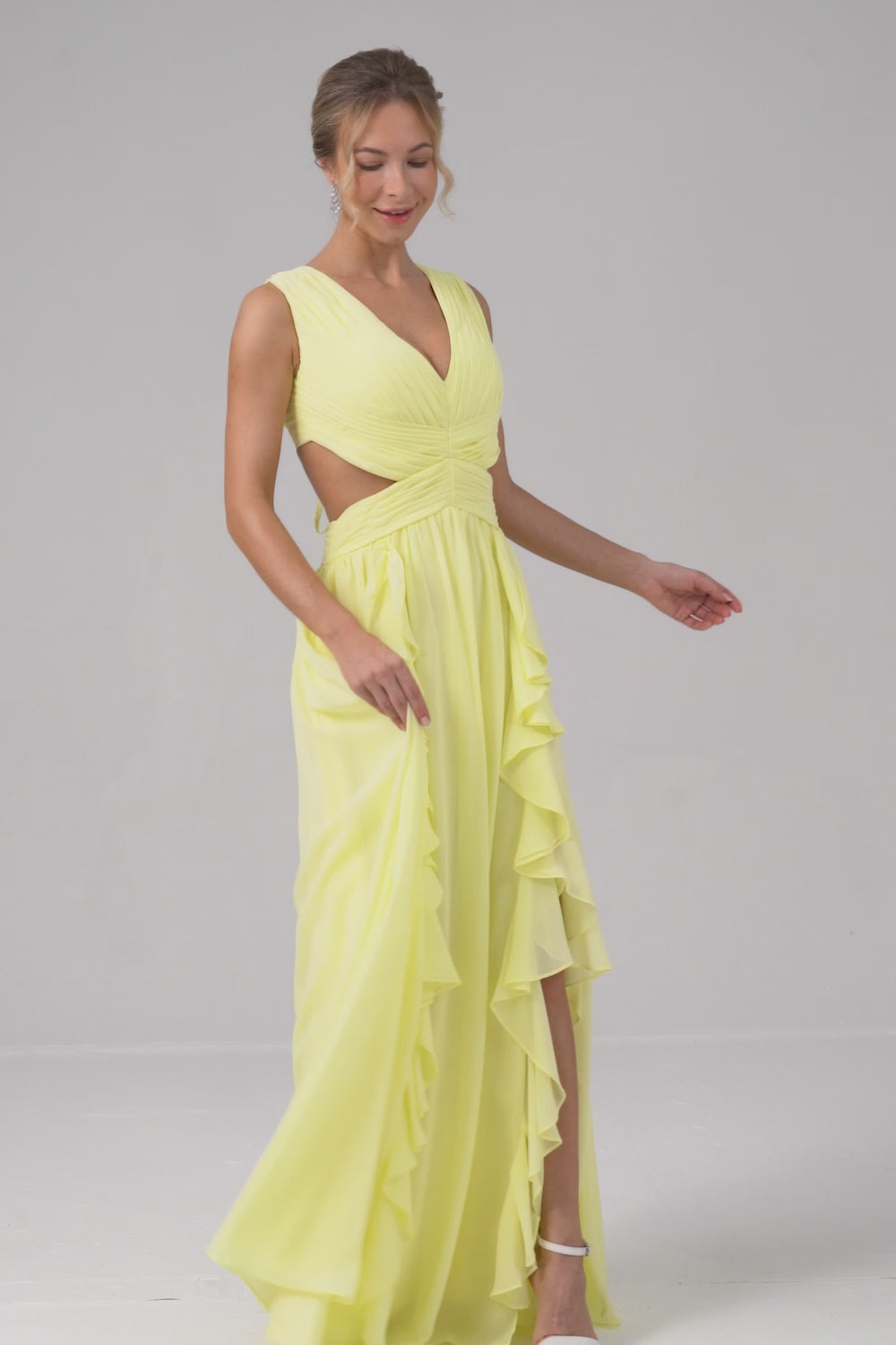 Lemon Yellow A Line Cut Out Long Bridesmaid Dress with Ruffles
