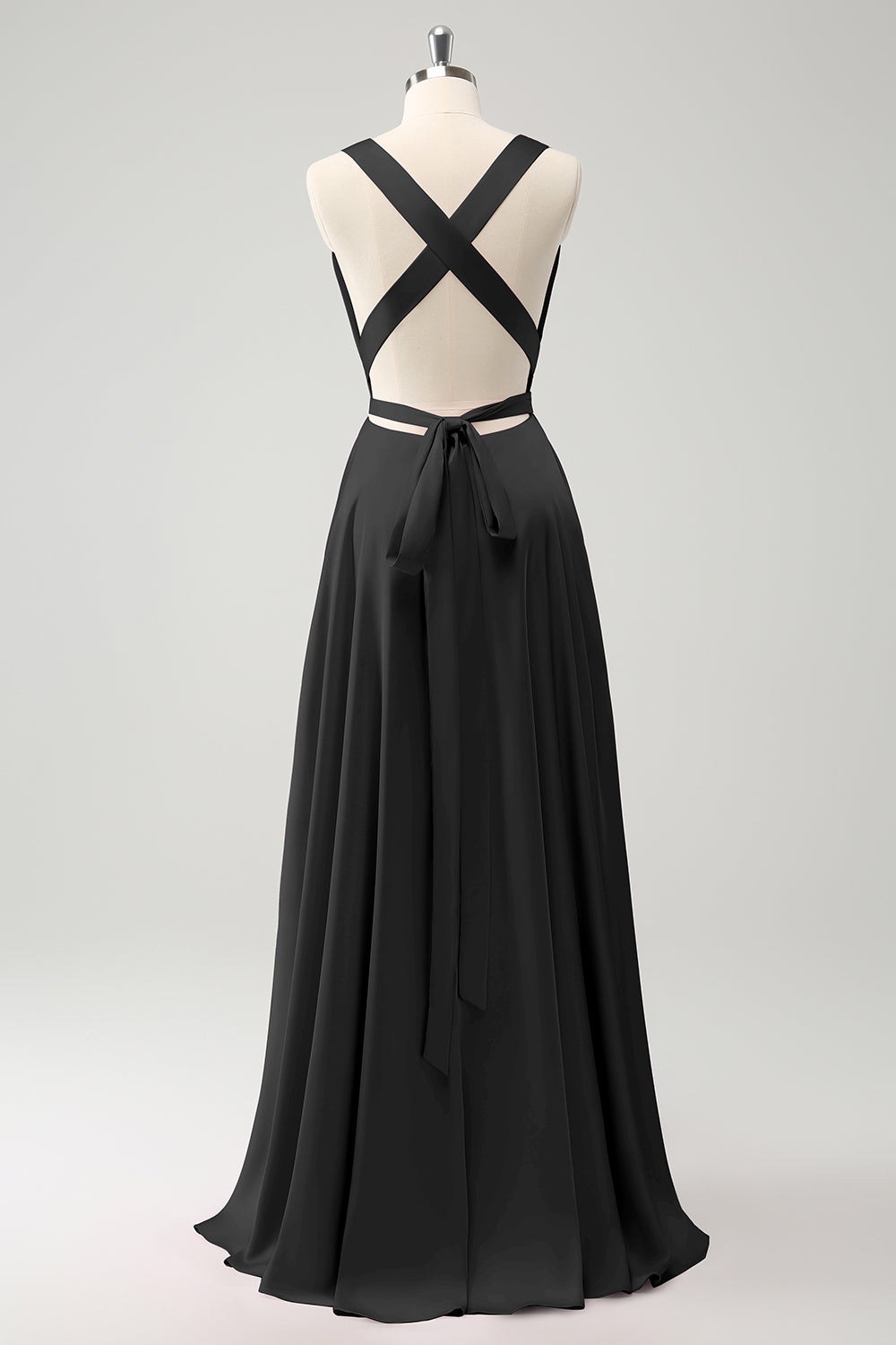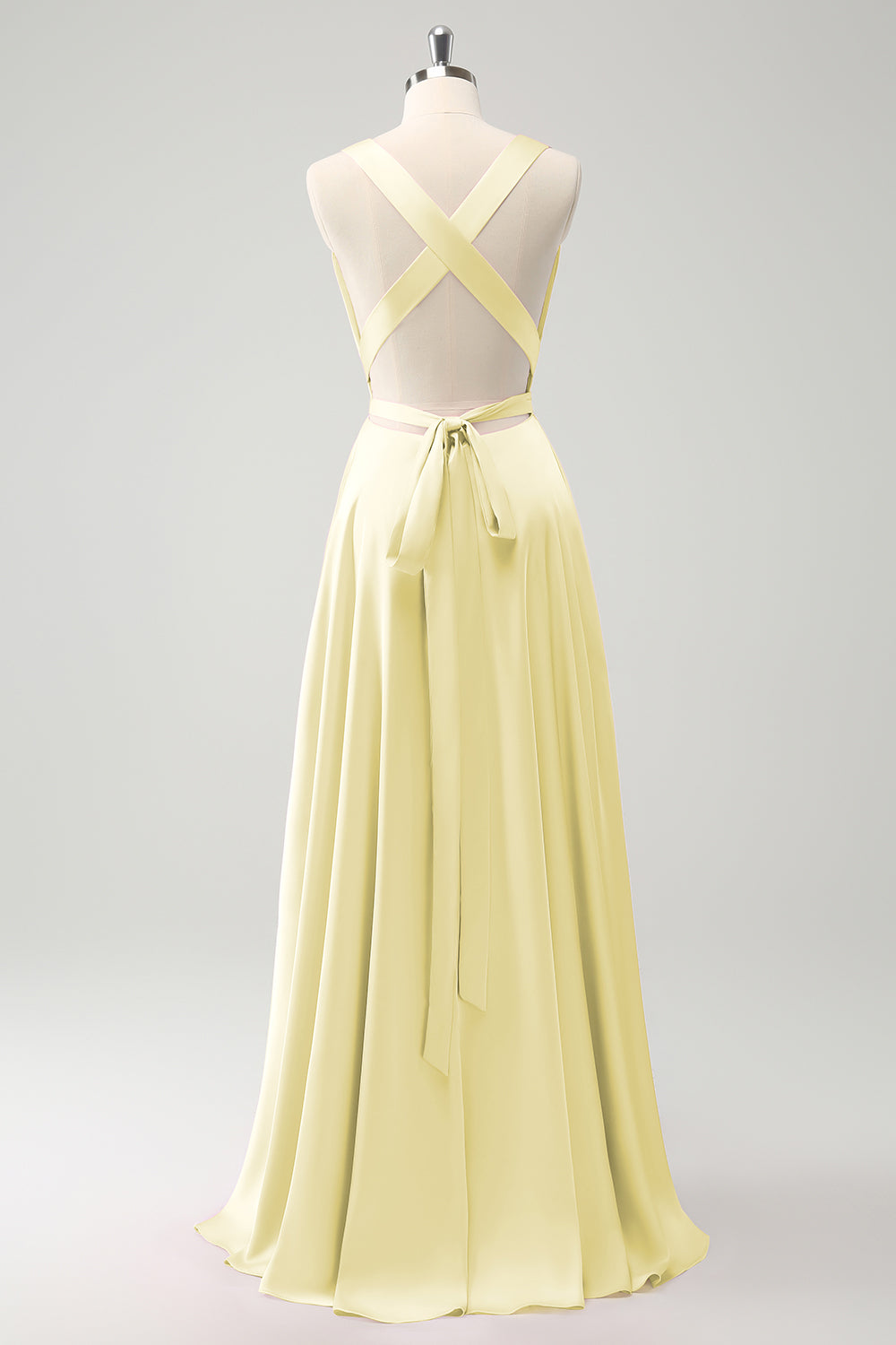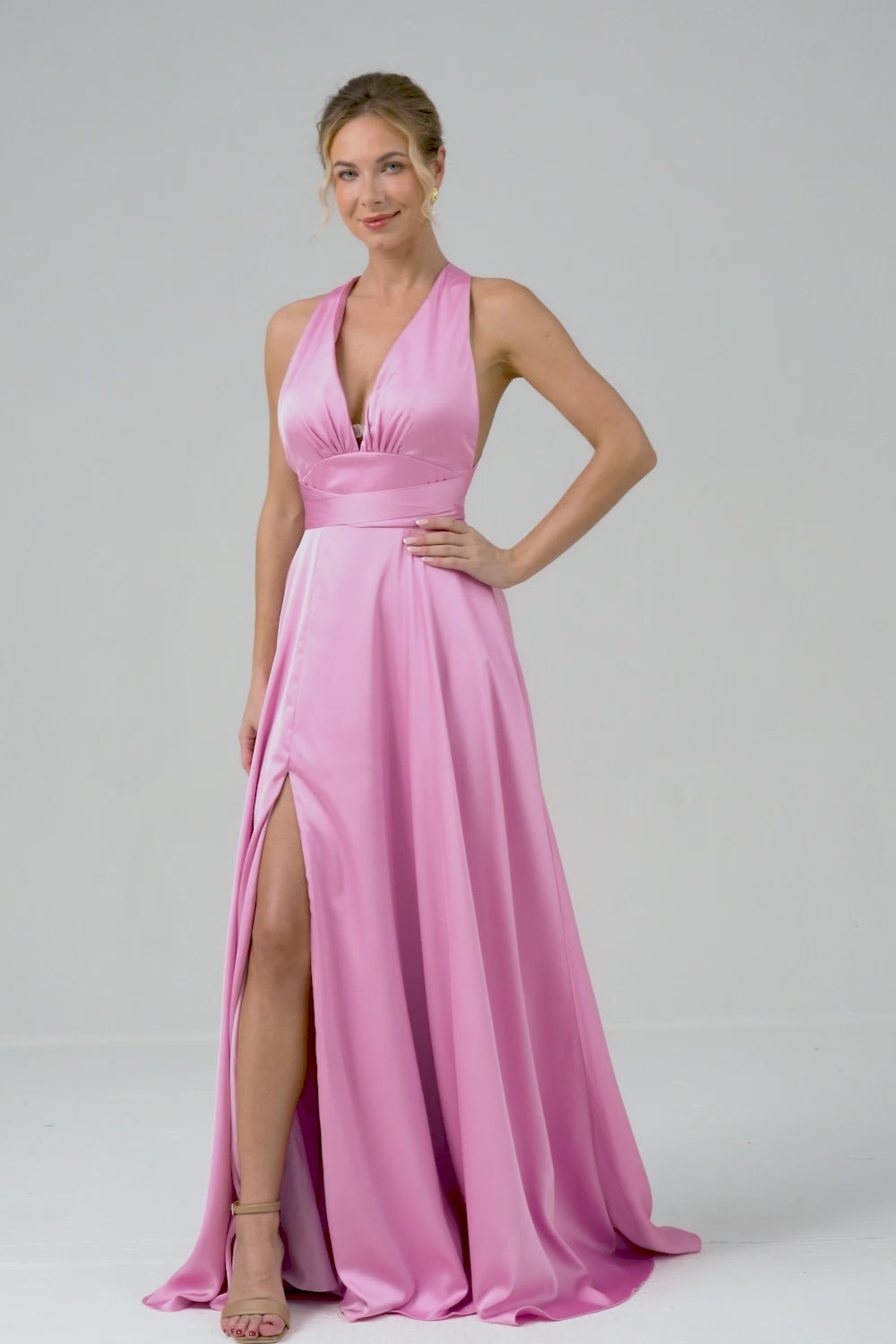 Pink A Line V-Neck Backless Bridesmaid Dress with Slit
