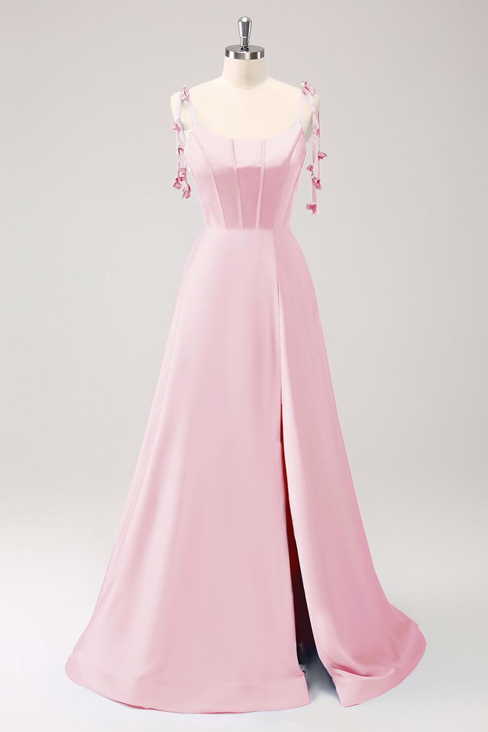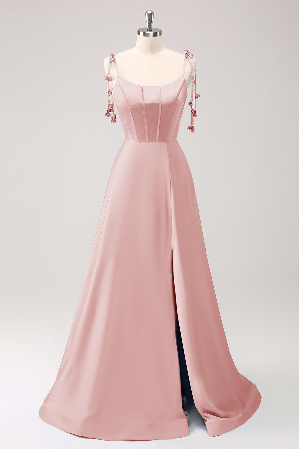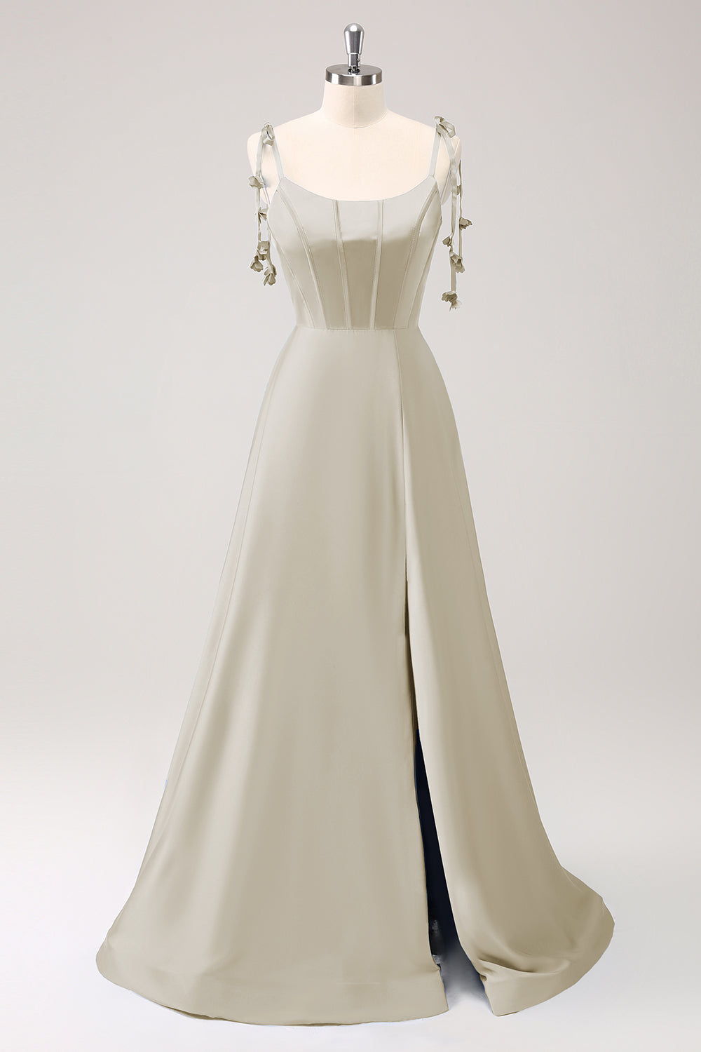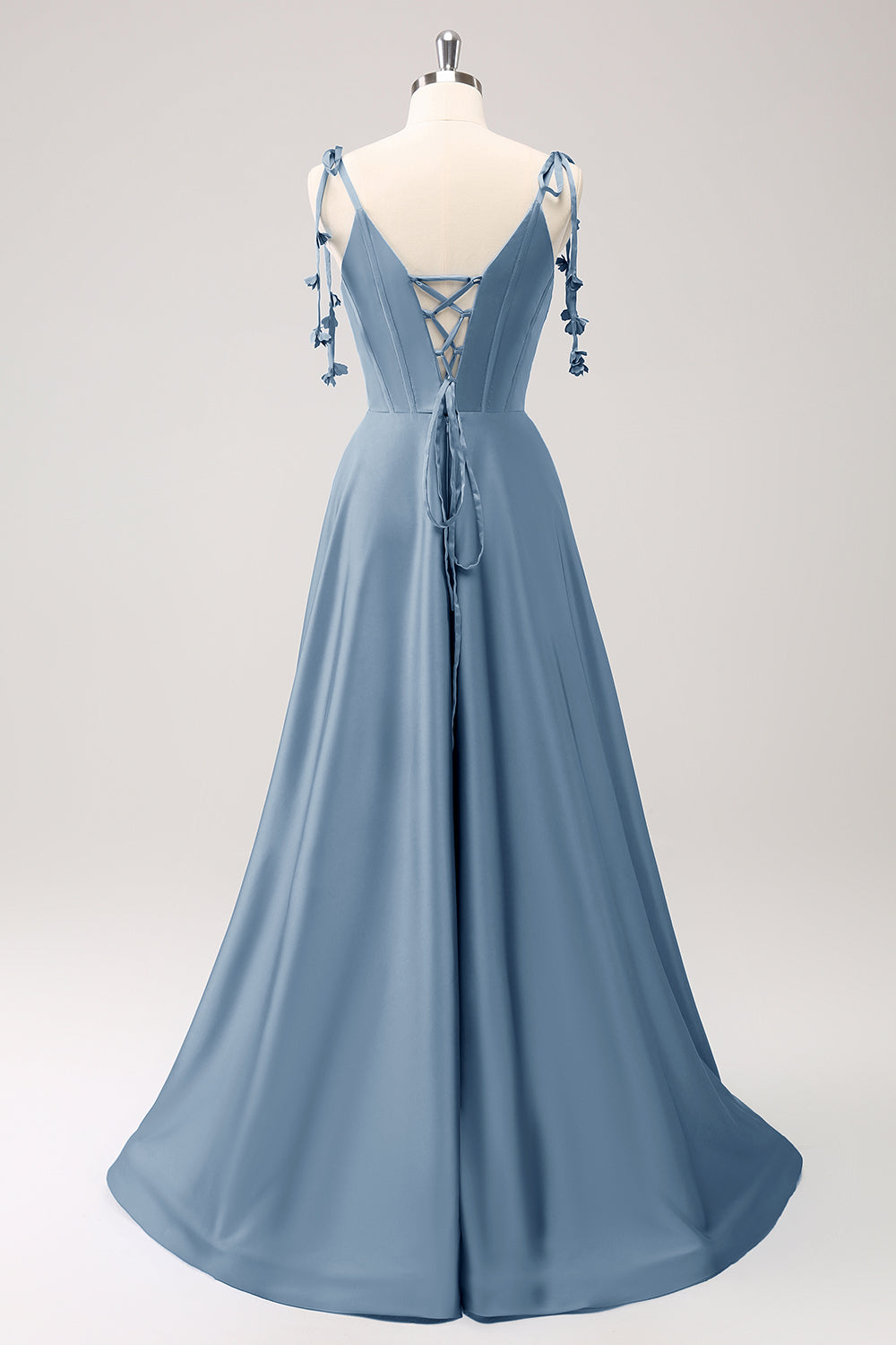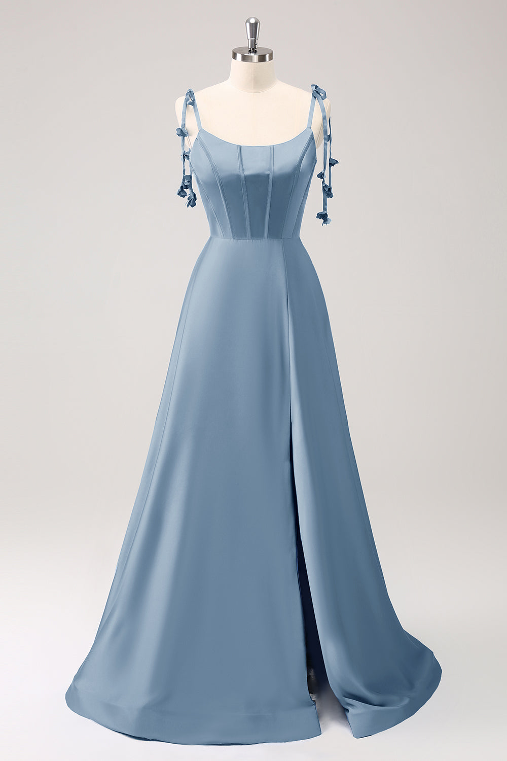 Blue A Line Spaghetti Straps Satin Long Prom Dress with Slit