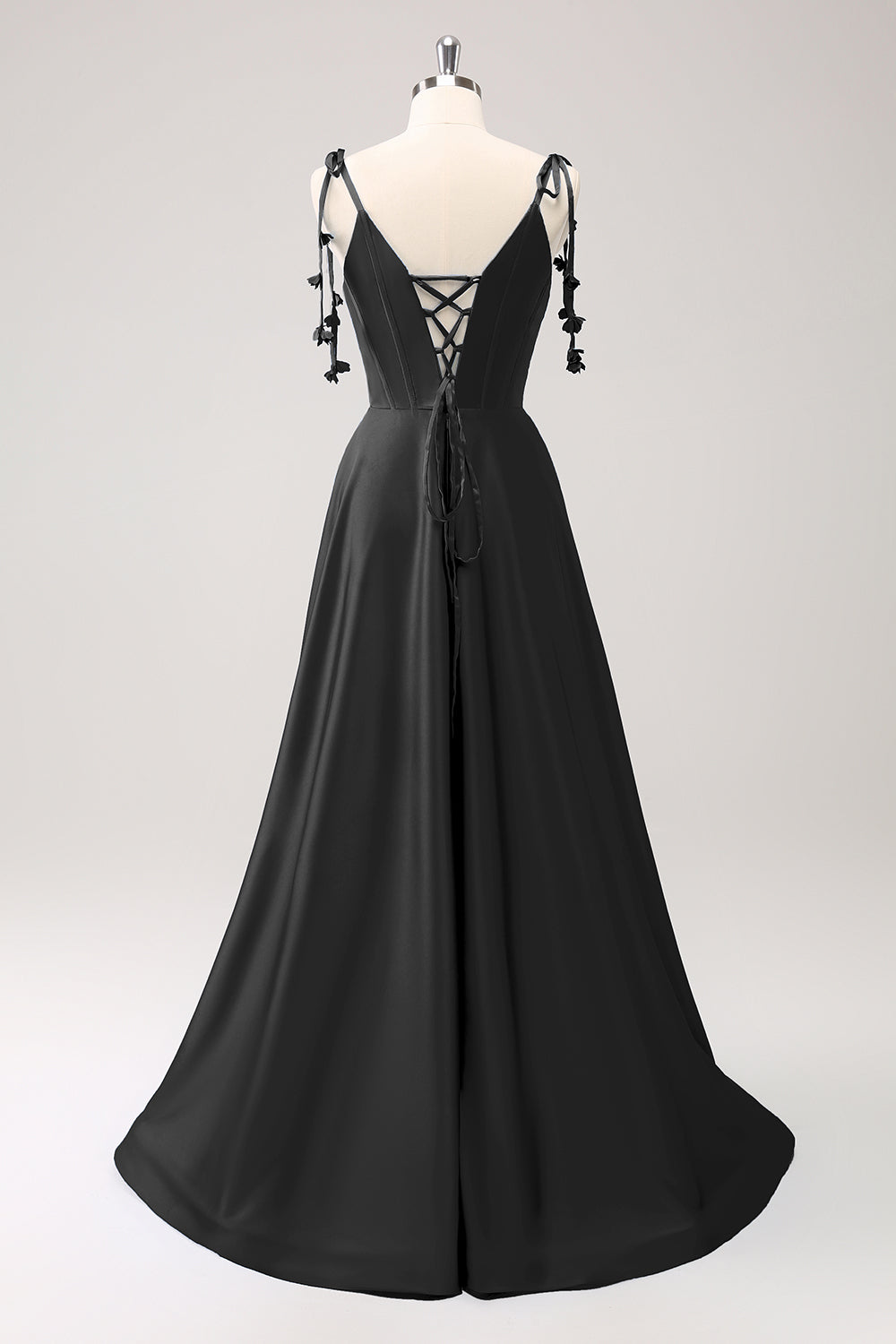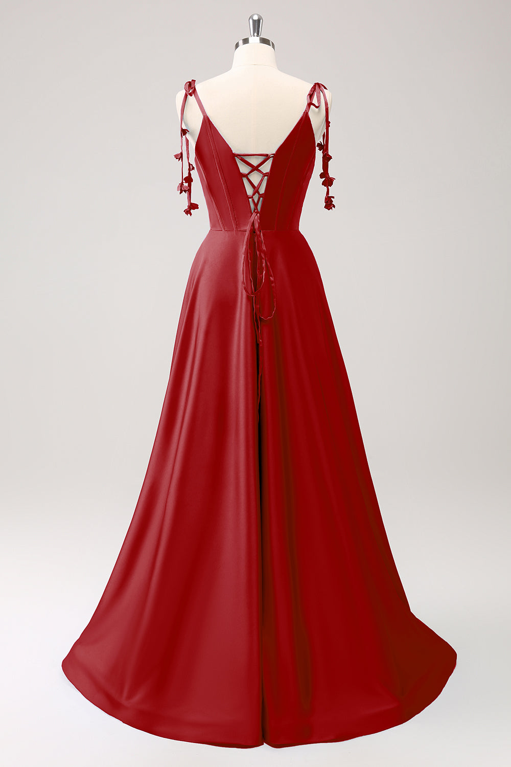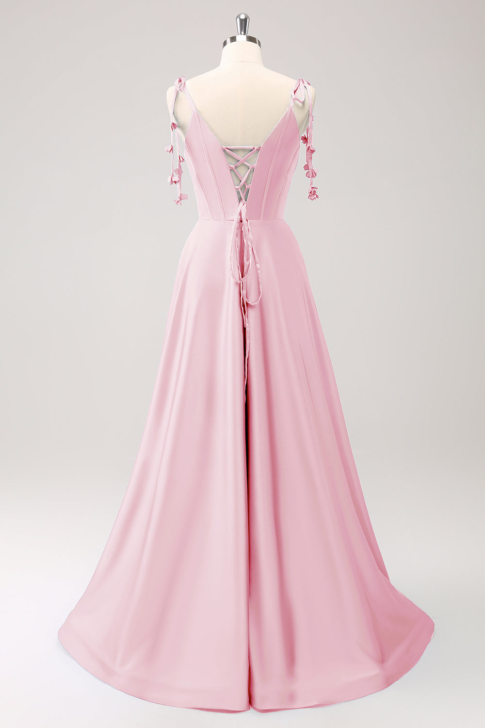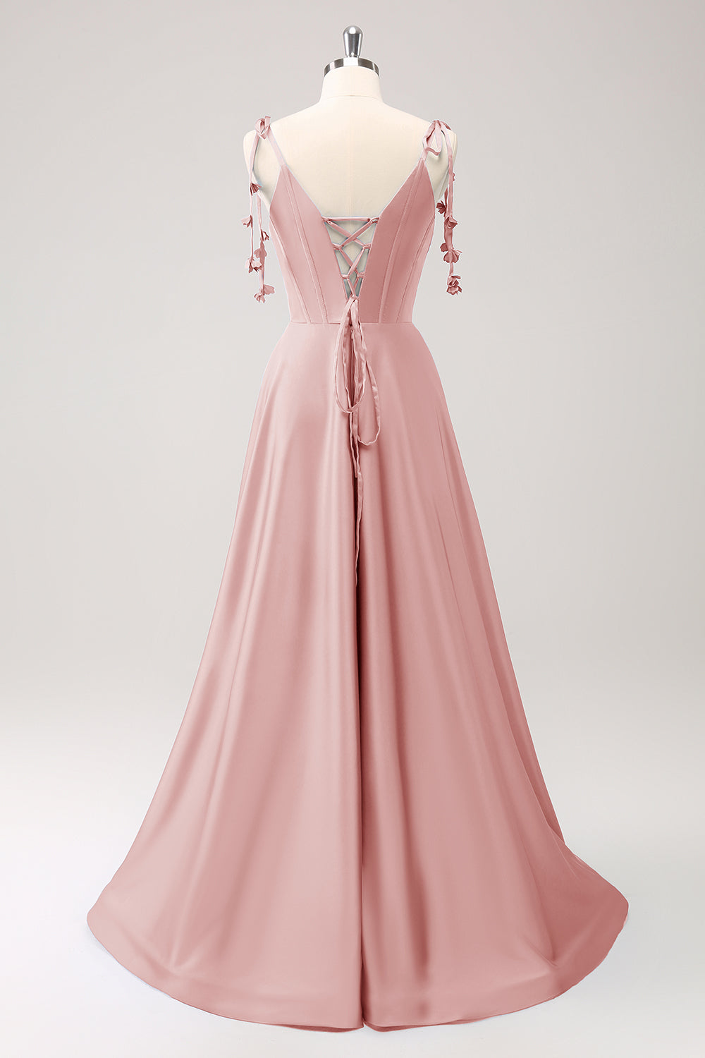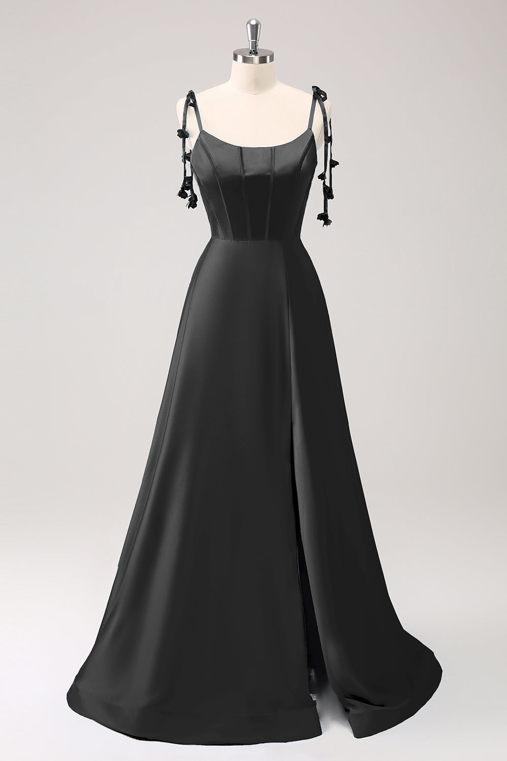 Blue A Line Spaghetti Straps Satin Long Prom Dress with Slit