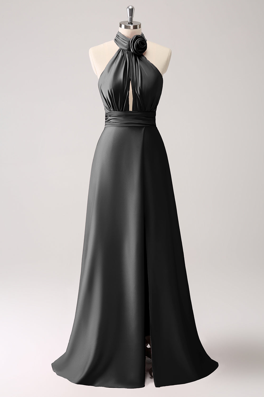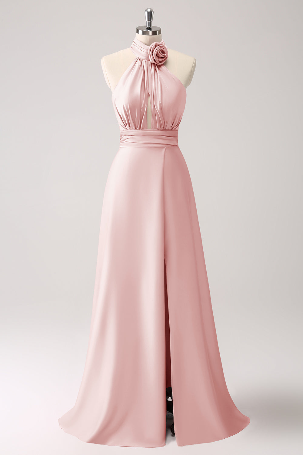 Pink Keyhole A-Line Satin Bridesmaid Dress with Slit