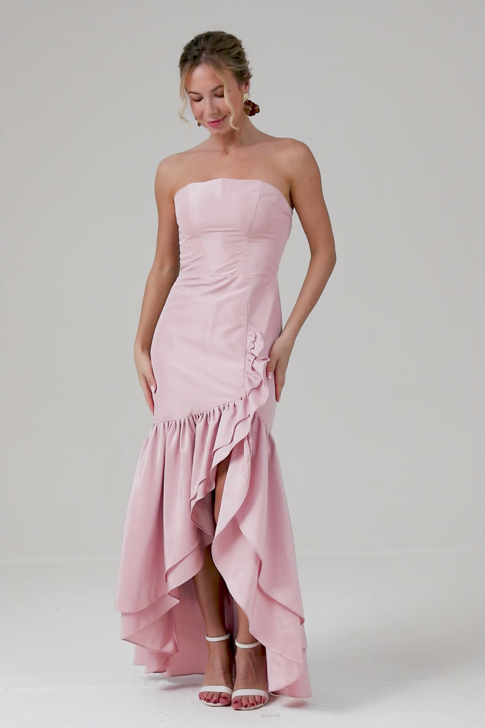 Pink Strapless Asymmetrical Ruffled Bridesmaid Dress