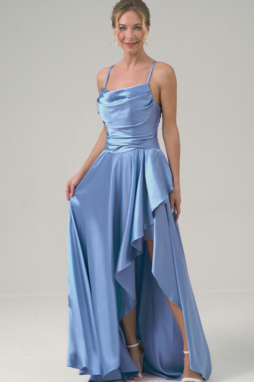 Blue Cowl Neck Satin Asymmetrical Bridesmaid Dress with Slit