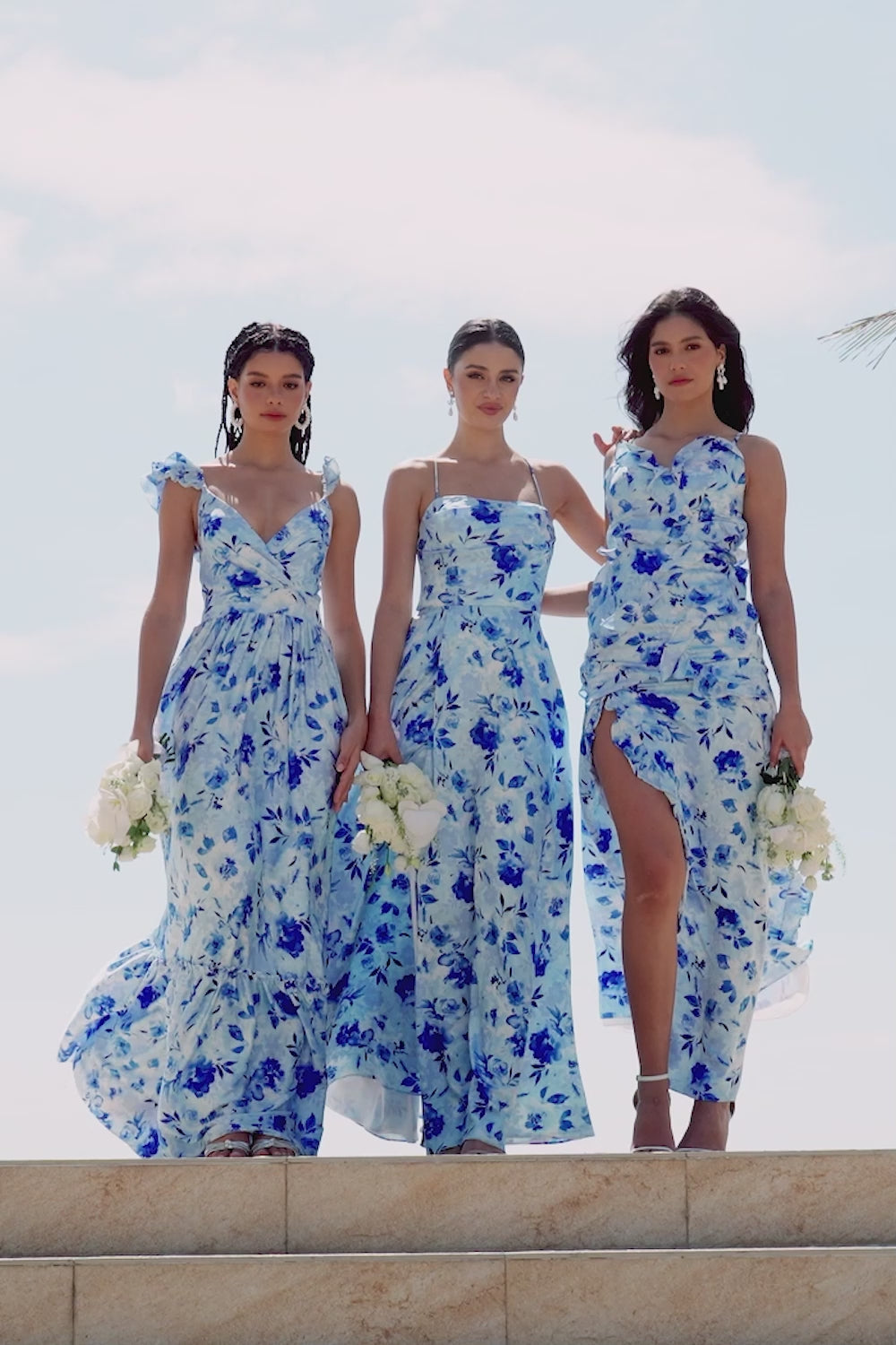 Blue A Line Floral Spaghetti Straps Long Bridesmaid Dress with Slit