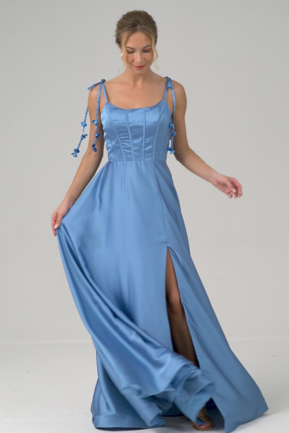 Blue A Line Spaghetti Straps Corset Satin Long Bridesmaid Dress with Slit
