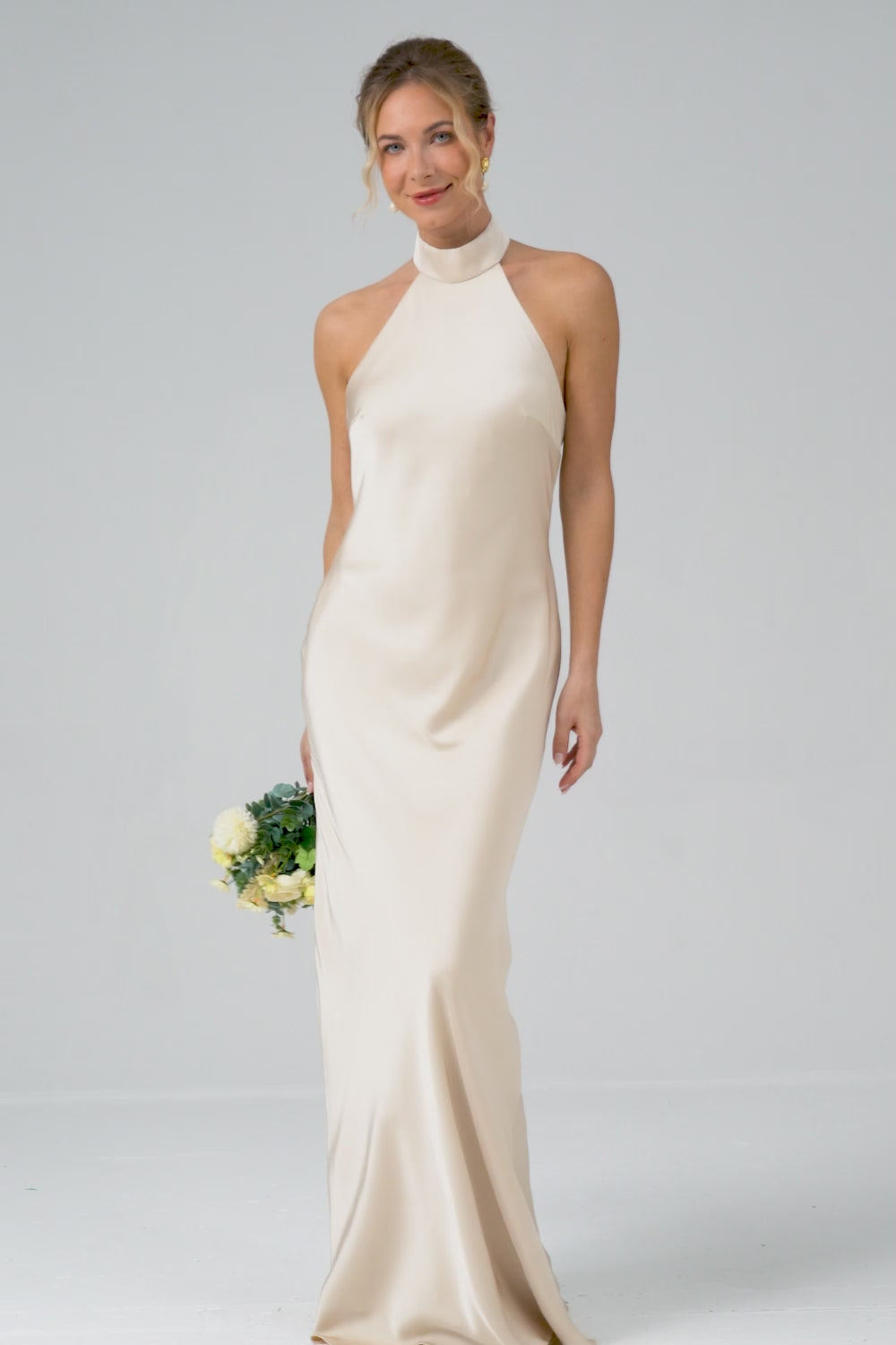 Champagne Sheath Halter Long Bridesmaid Dress With Slit