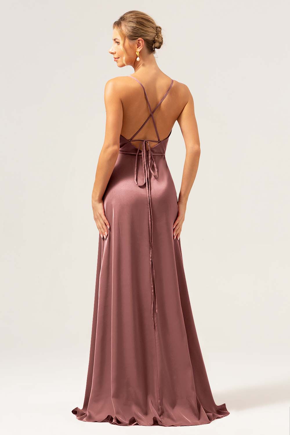 Dark Red A Line Spaghetti Straps Backless Satin Long Bridesmaid Dress with Slit