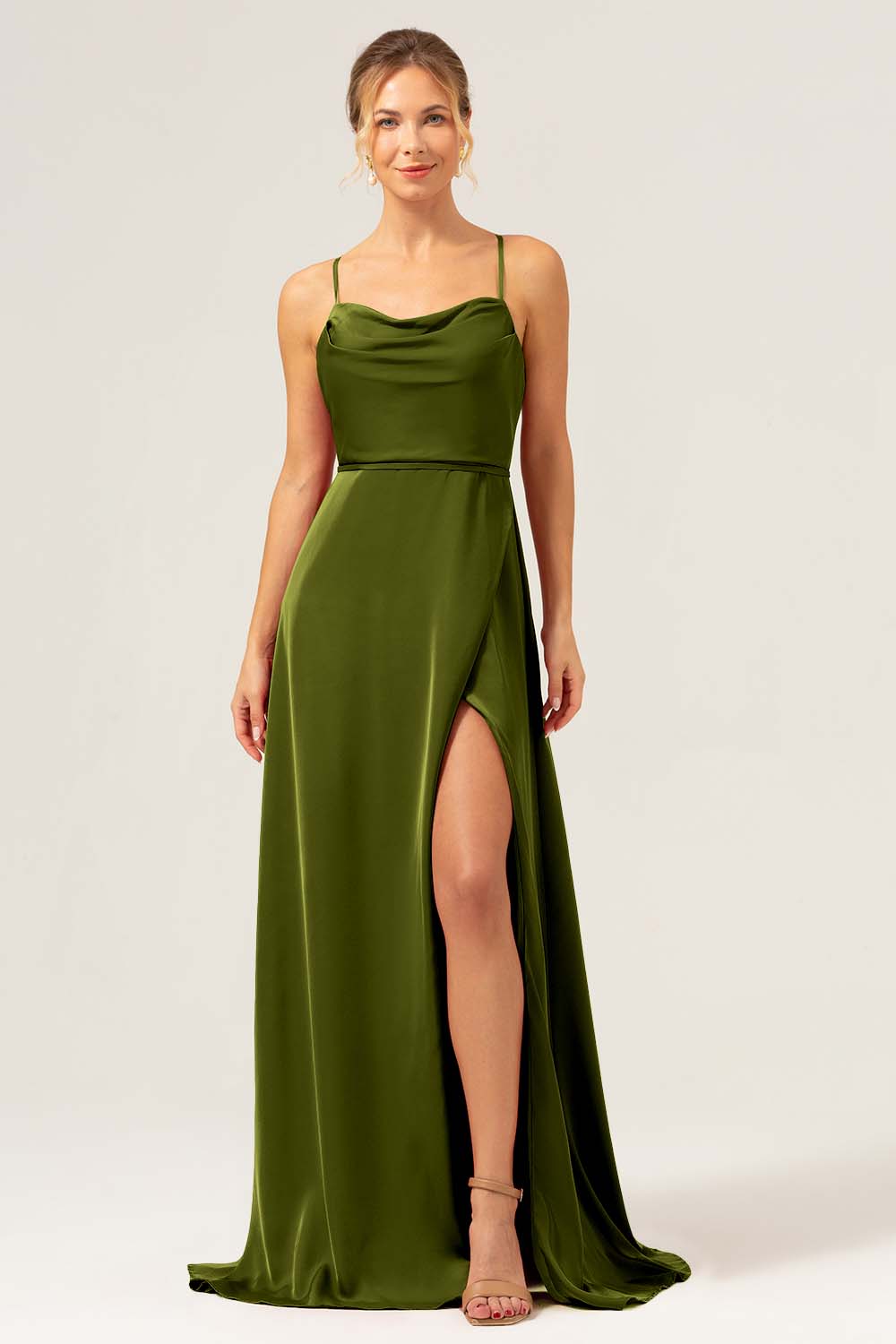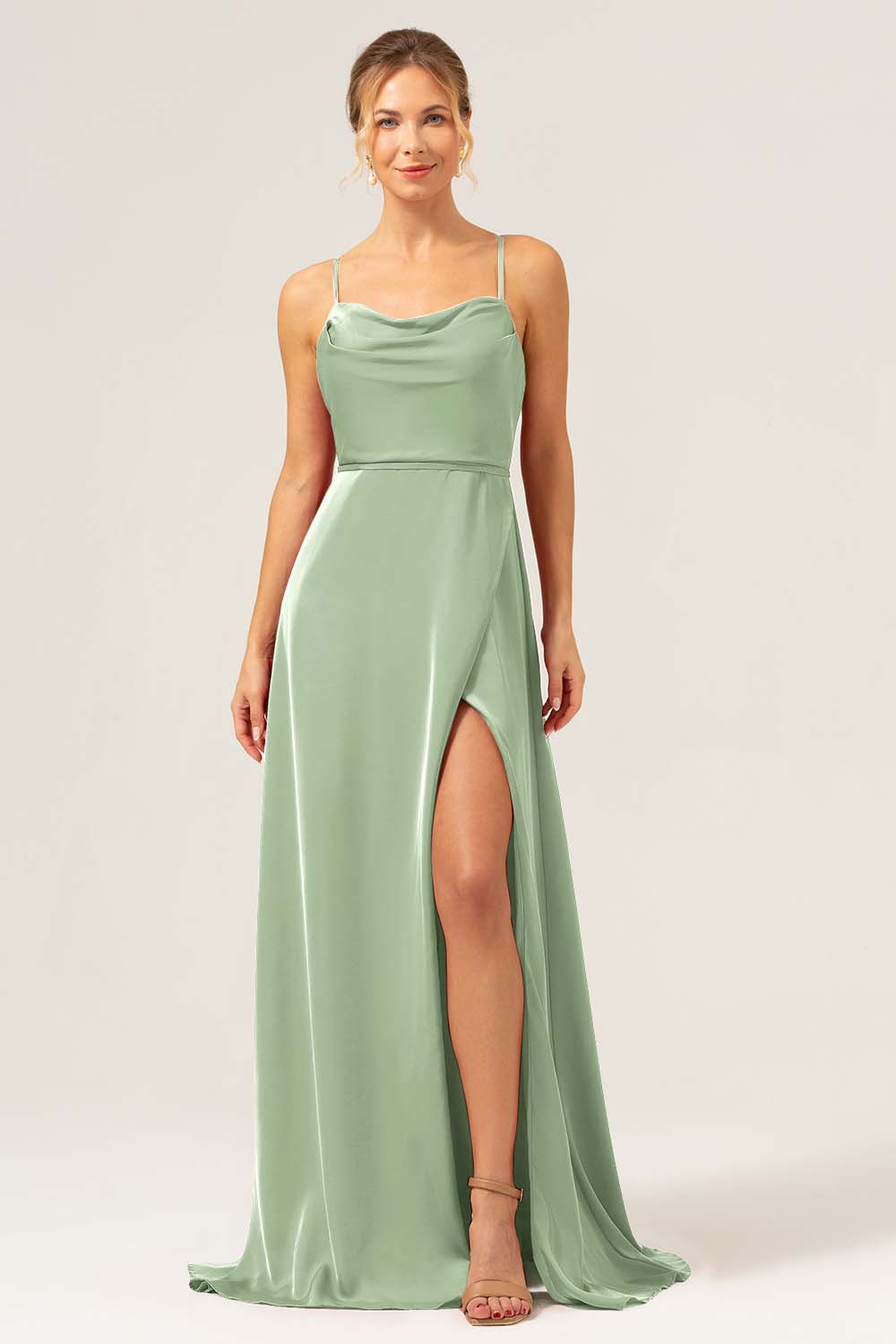 Dusty Blue A Line Spaghetti Straps Backless Satin Long Bridesmaid Dress with Slit
