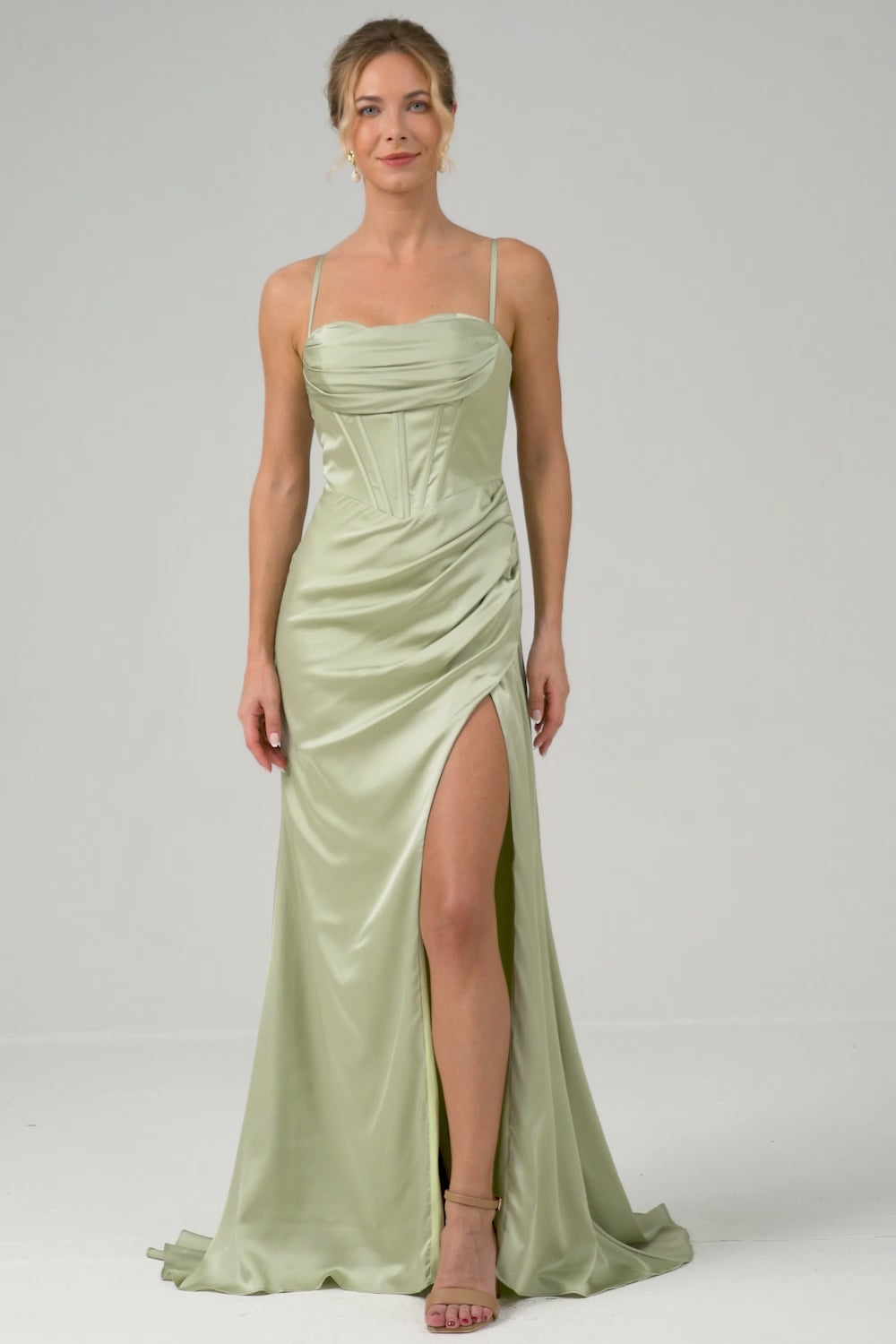 Sage Mermaid Spaghetti Straps Corset Satin Bridesmaid Dress with Slit