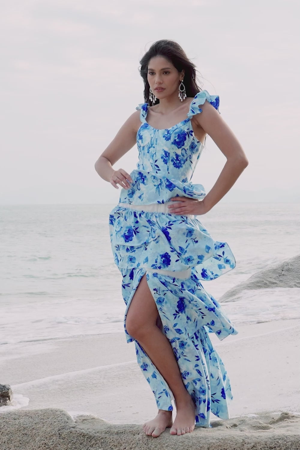 Blue Floral A Line Corset Tiered Long Bridesmaid Dress with Slit