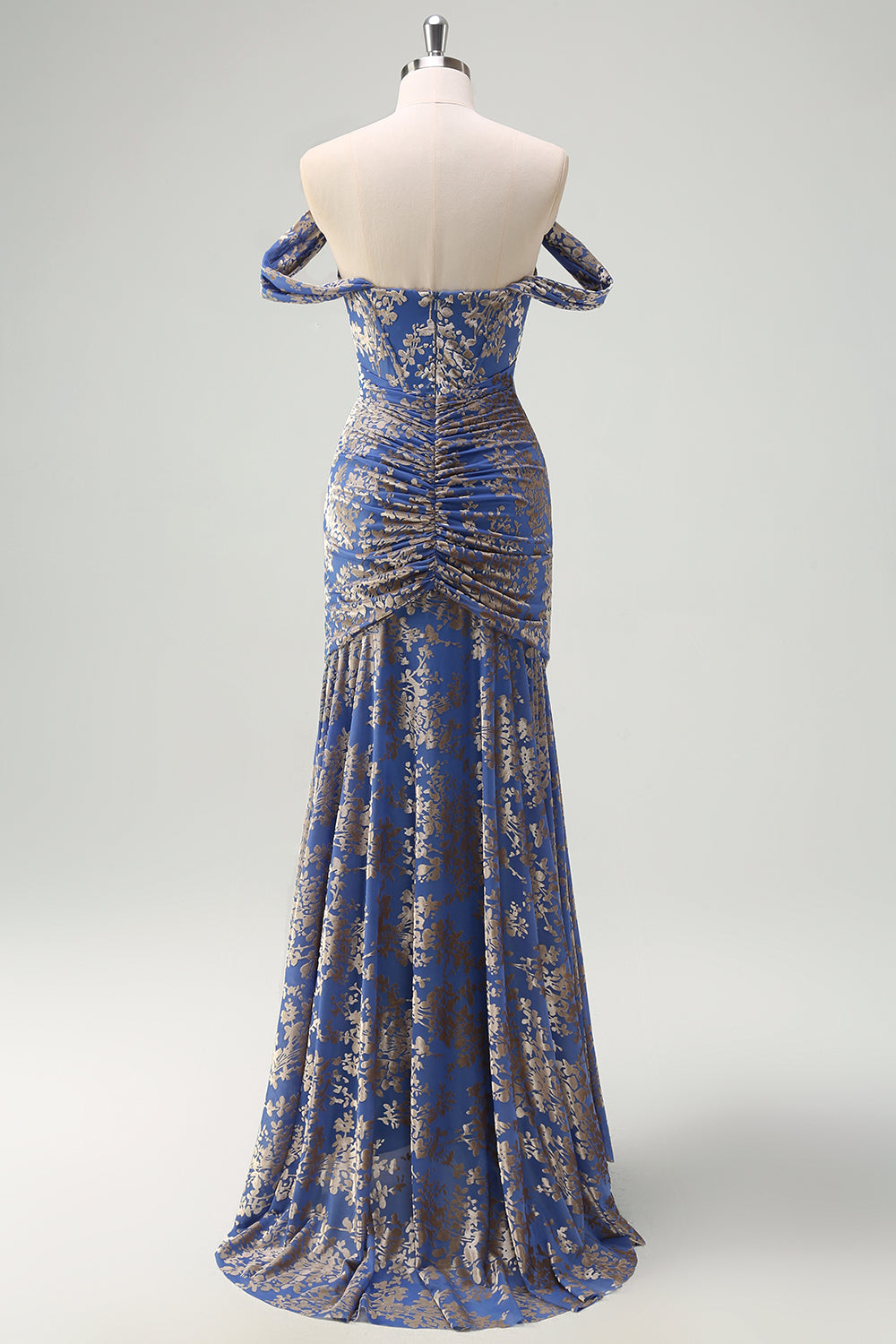 Corset Grey Blue Mermaid Off the Shoulder Ruched Long Bridesmaid Dress