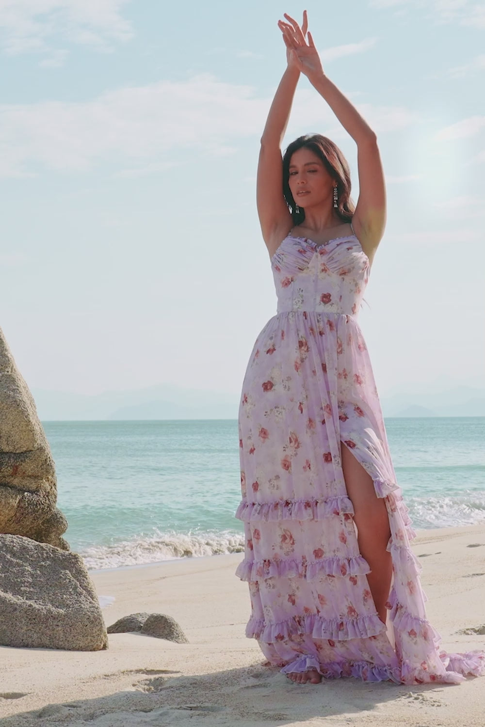 Grey Purple Floral Chiffon Long Bridesmaid Dress with Ruffles