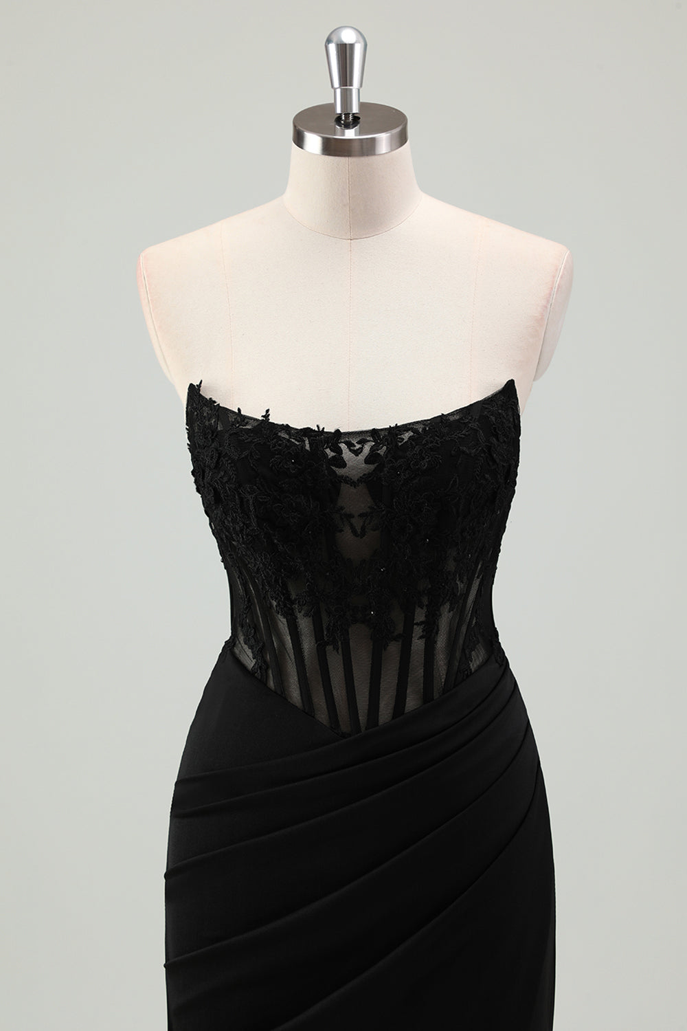 Black Mermaid Strapless Corset Appliqued Long Prom Dress with Slit