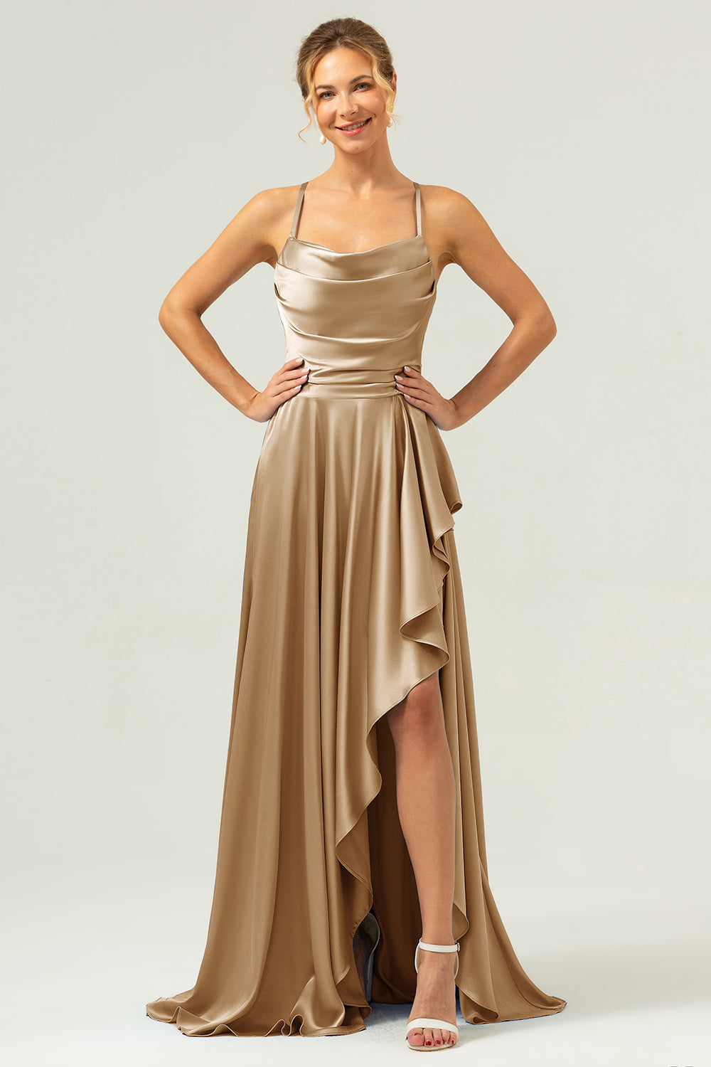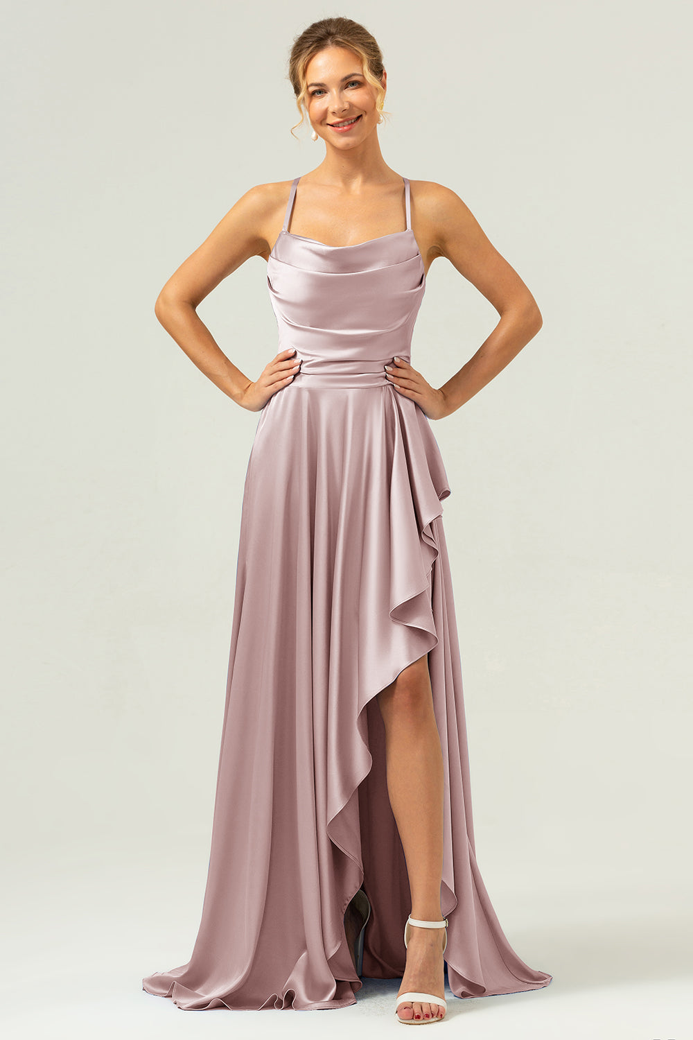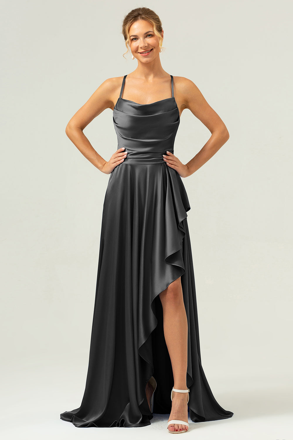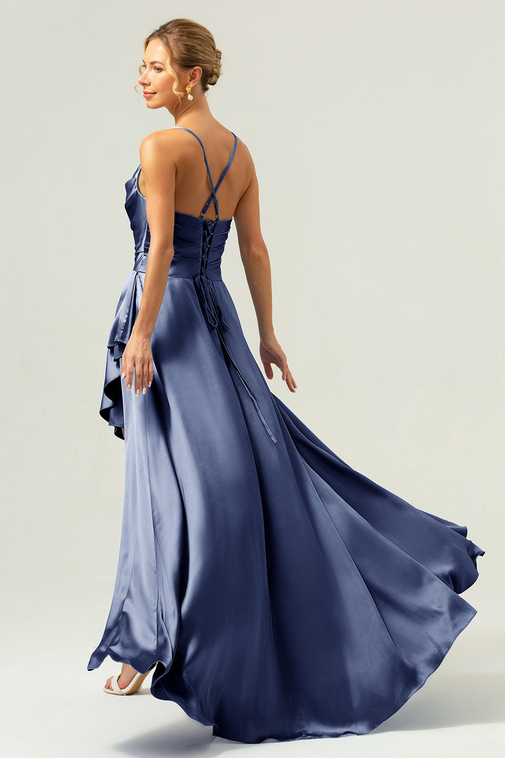 Blue Asymmetrical Cowl Neck Satin Bridesmaid Dress with Slit