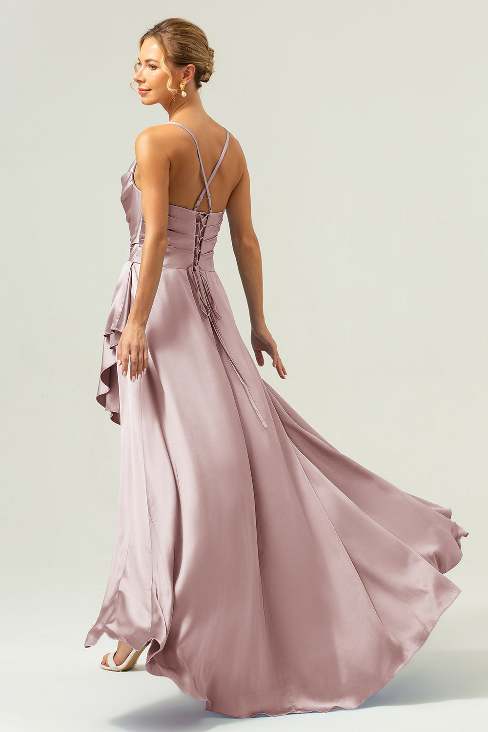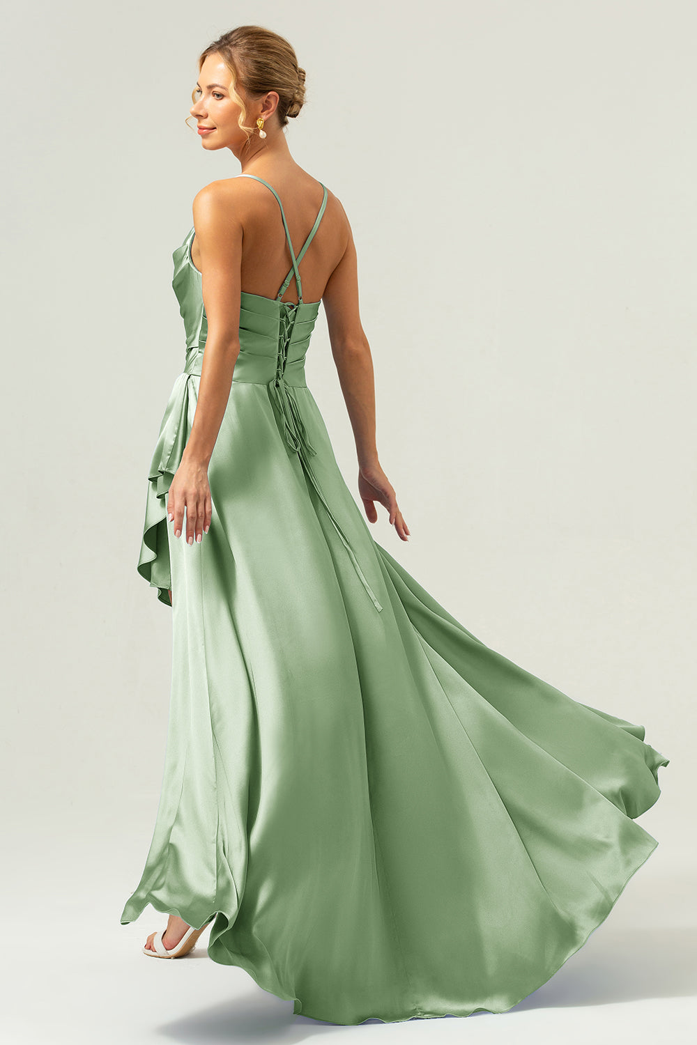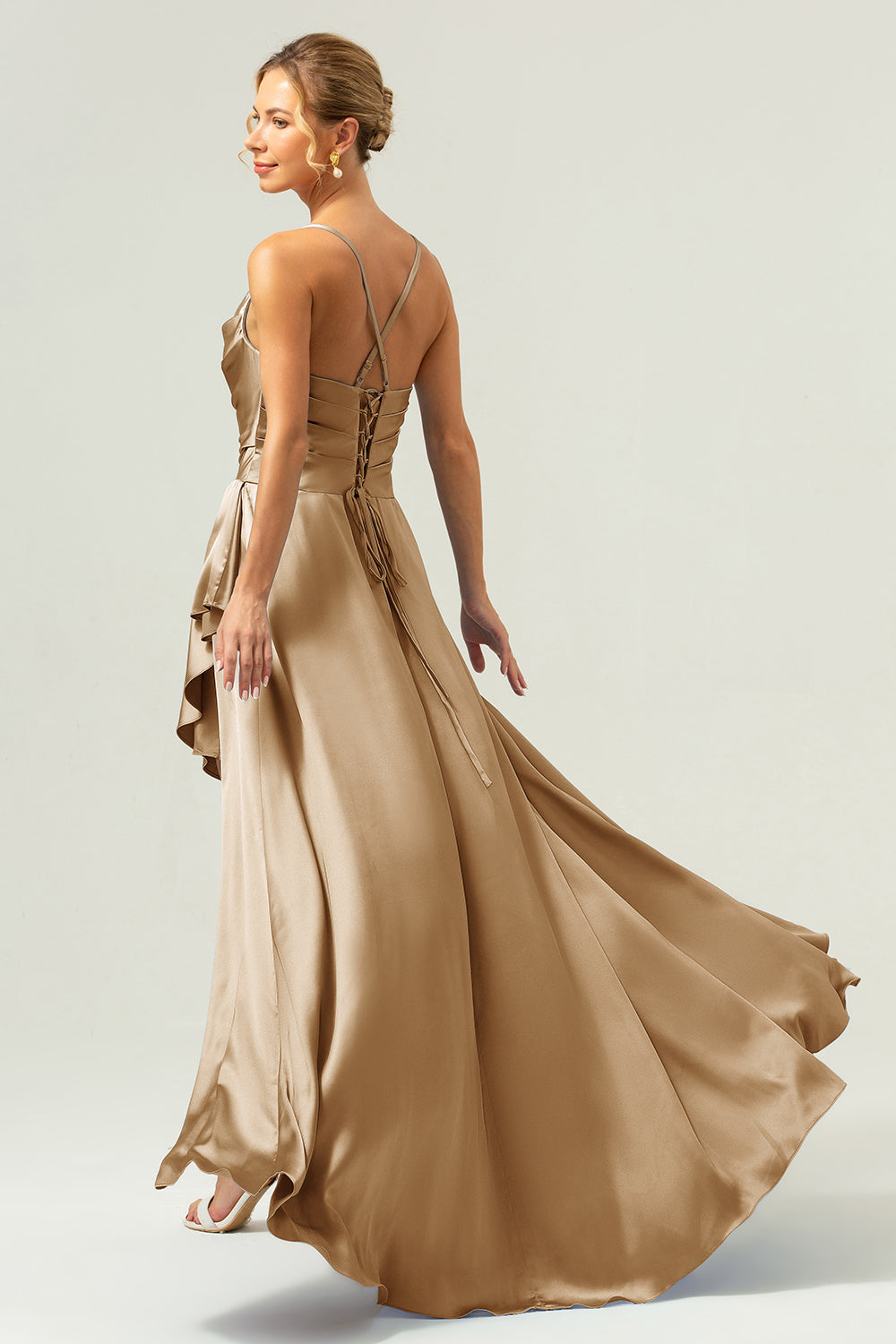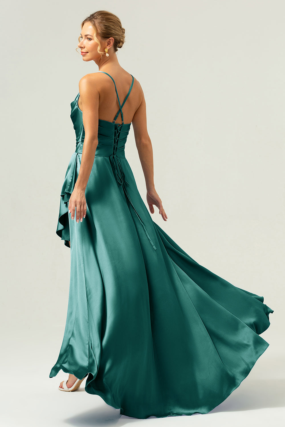 Blue Asymmetrical Cowl Neck Satin Bridesmaid Dress with Slit