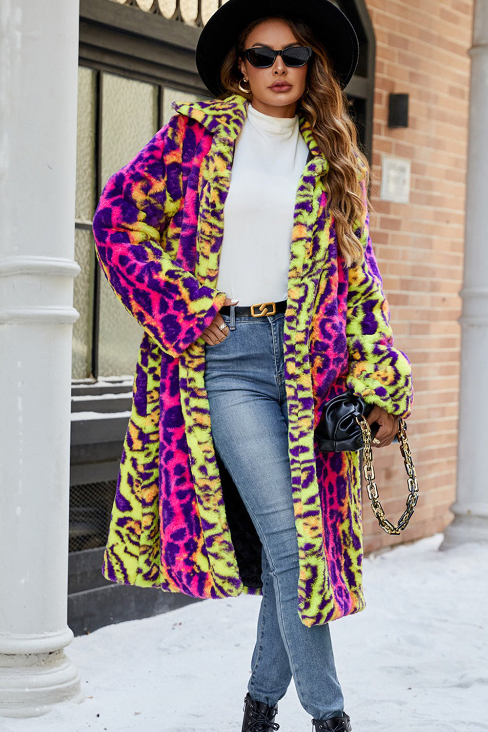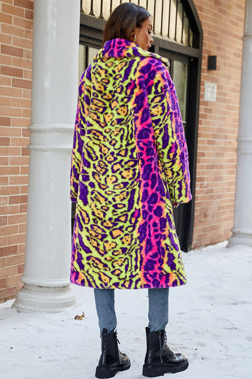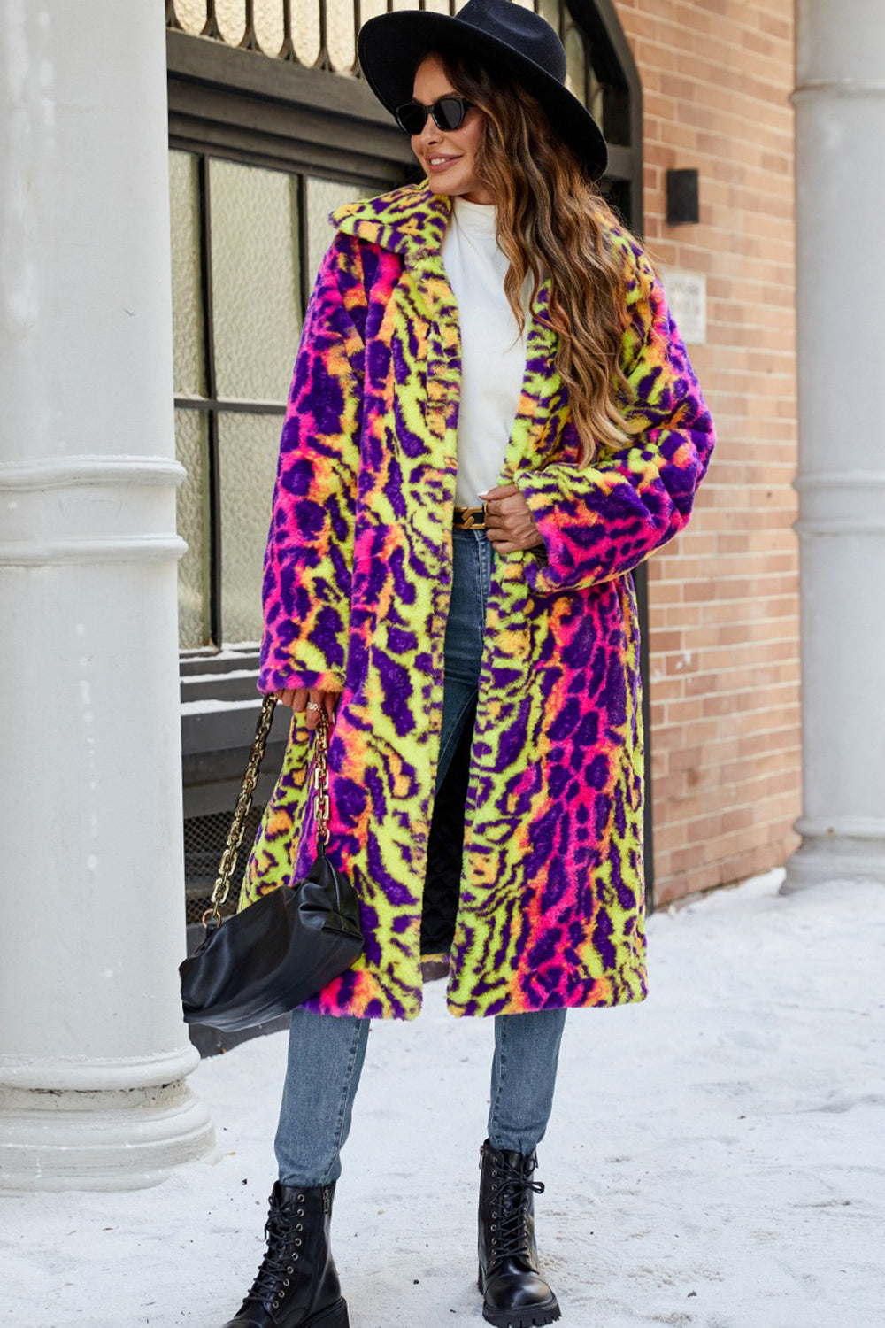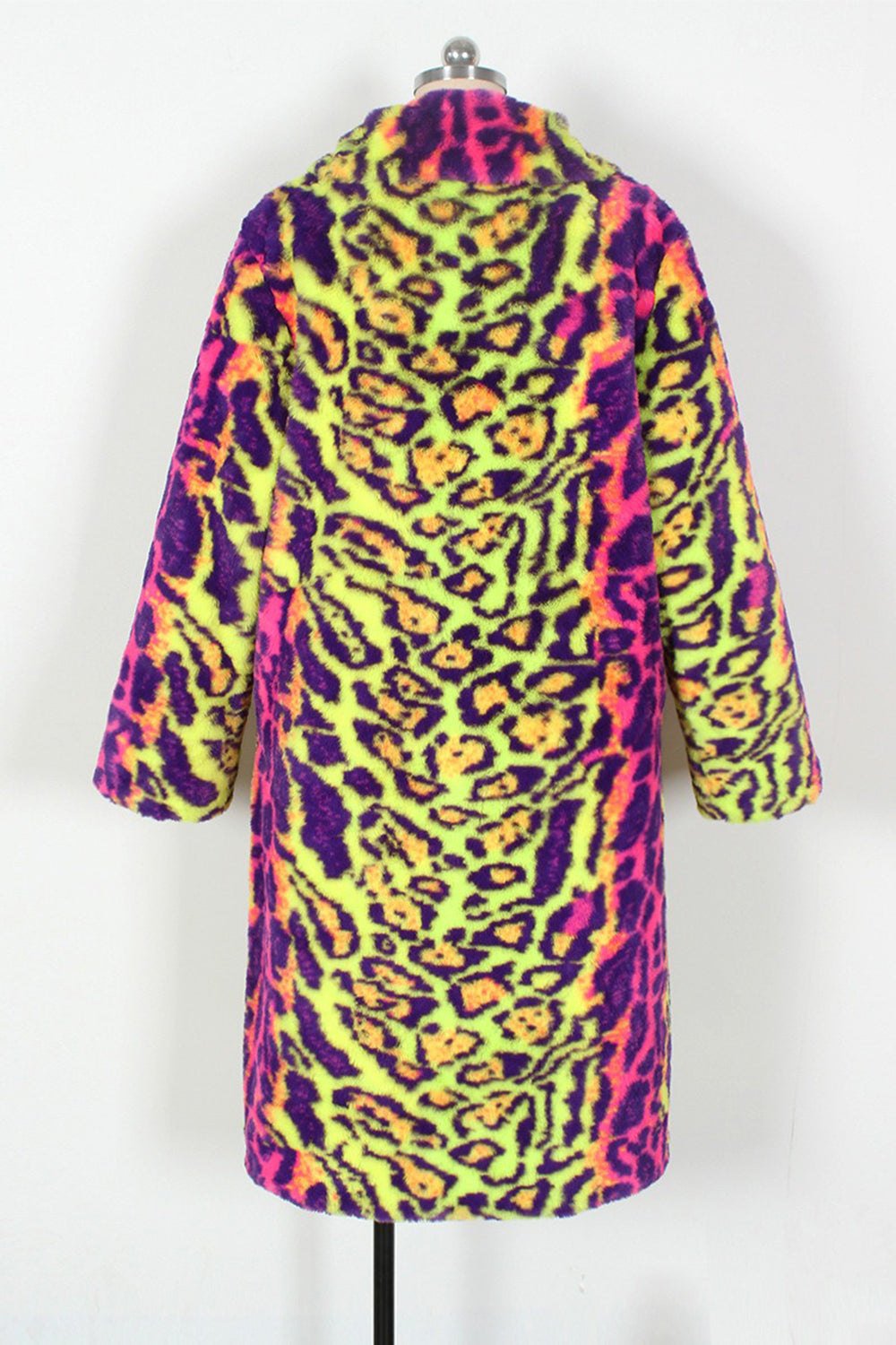 Yellow Leopard Faux Fur Shawl Lapel Midi Women Coat