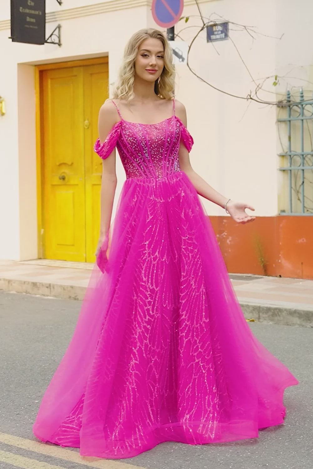 A-Line Cold Shoudler Sparkly Hot Pink Corset Prom Dress with Beading