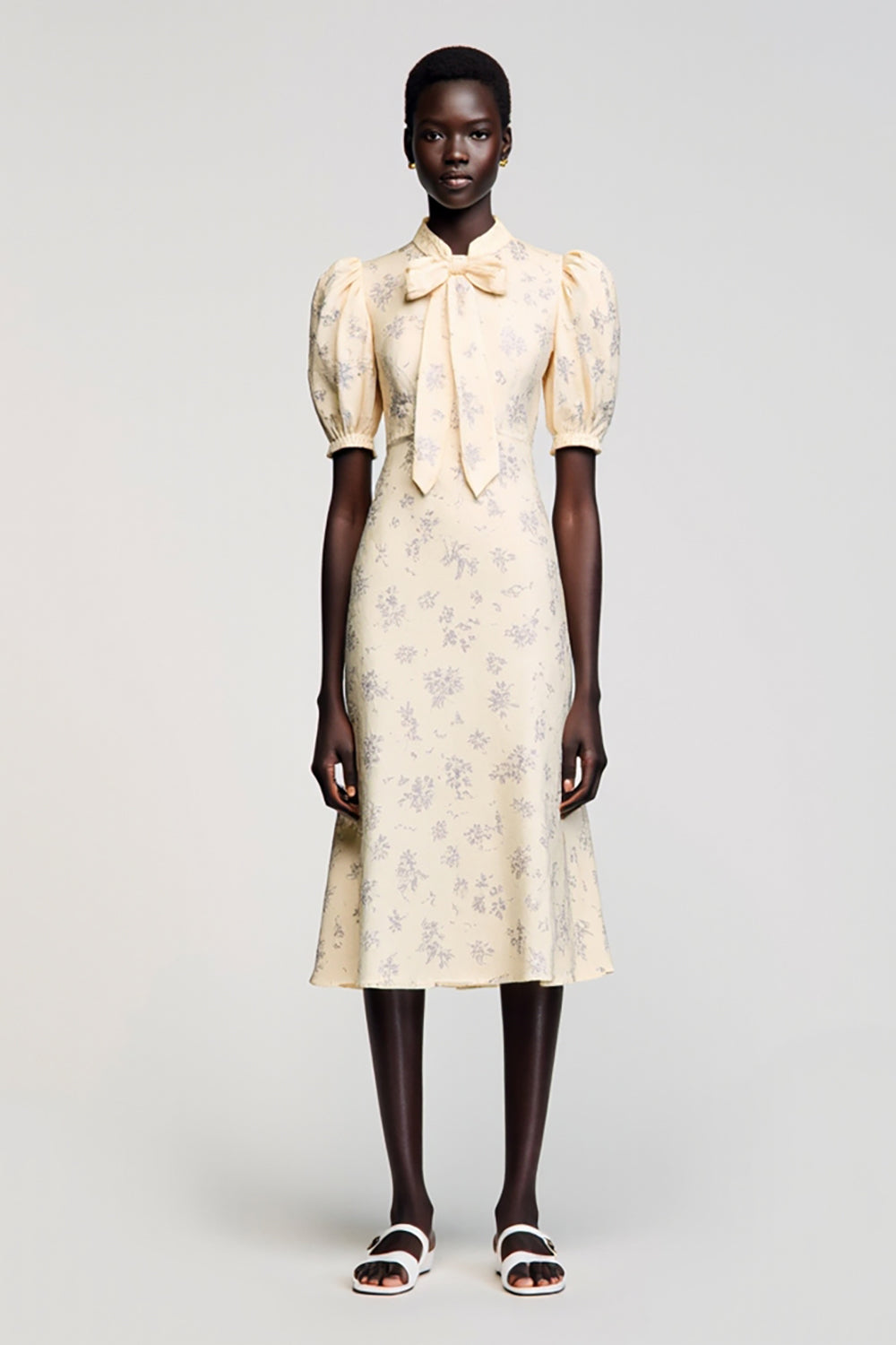 A Line High Neck Apricot Printed Wedding Guest Dress With Bow