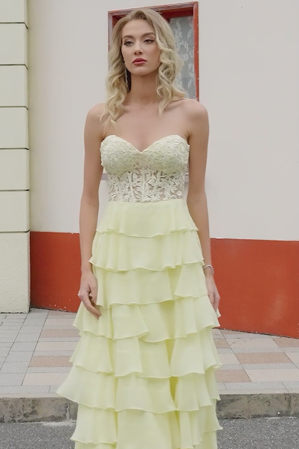 Gorgeous A Line Sweetheart Yellow Corset Prom Dress with Appliques Ruffles