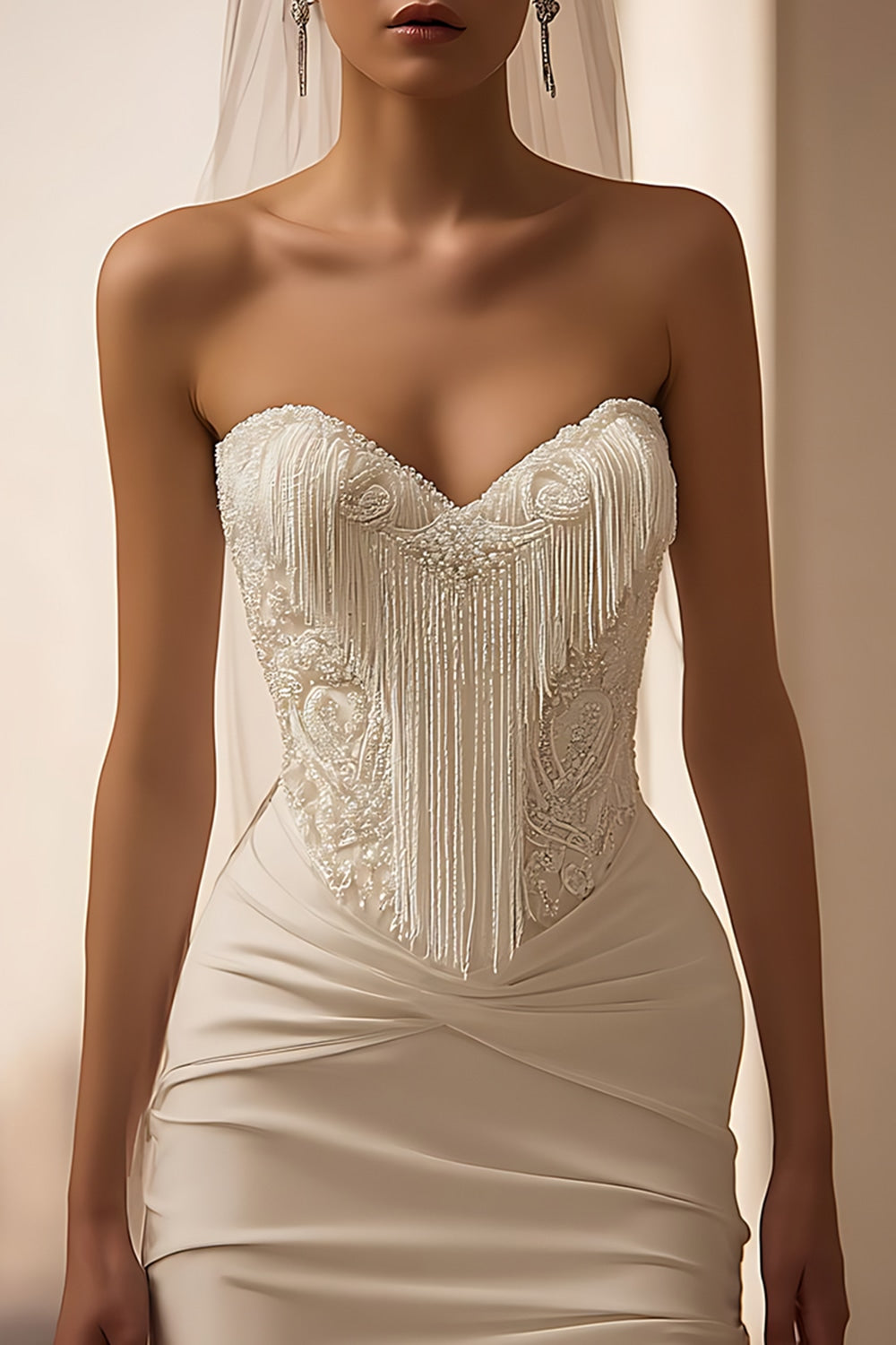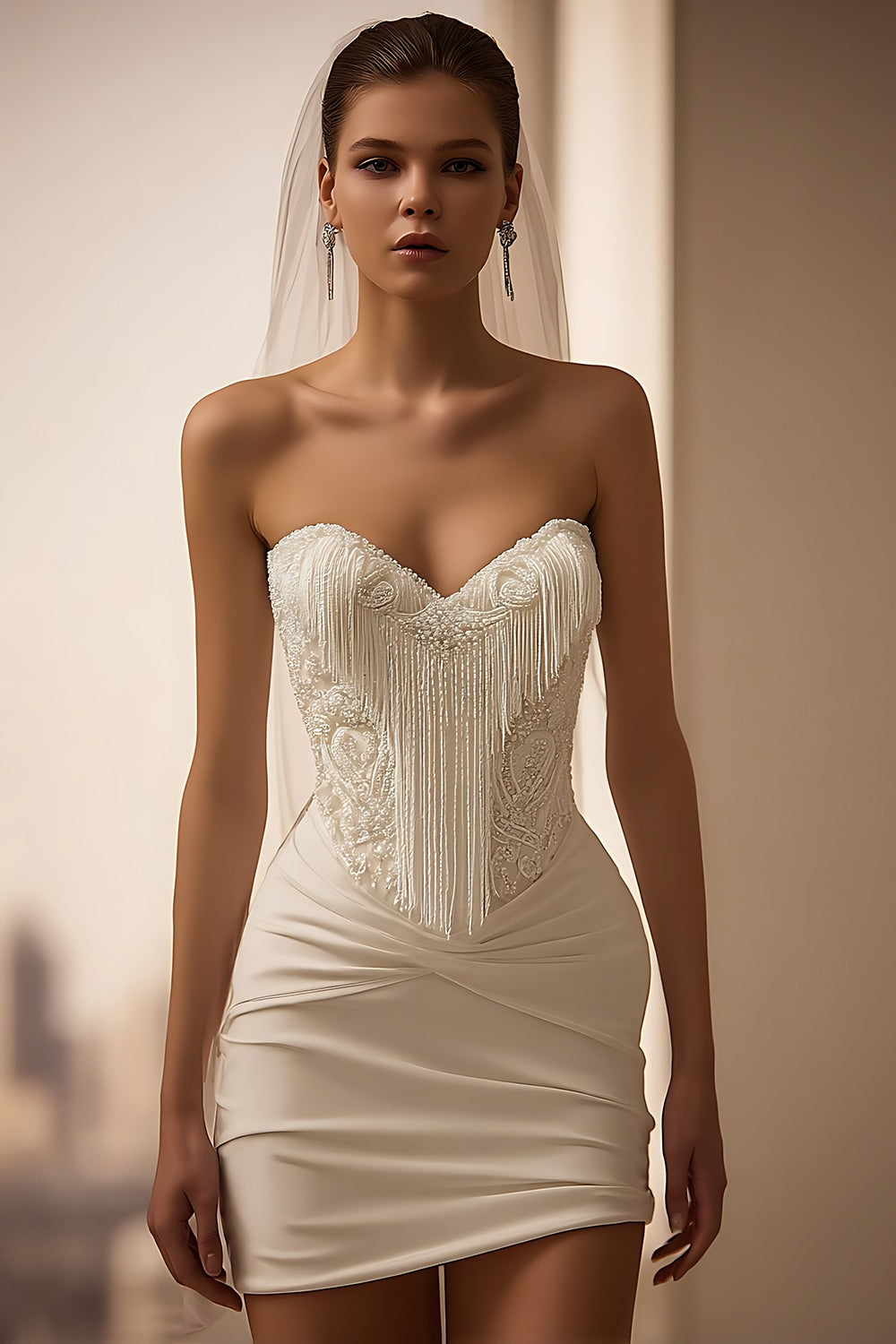 Ivory Satin Sweetheart Bodycon Short Wedding Dress with Fringes