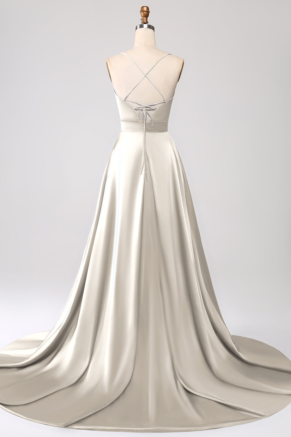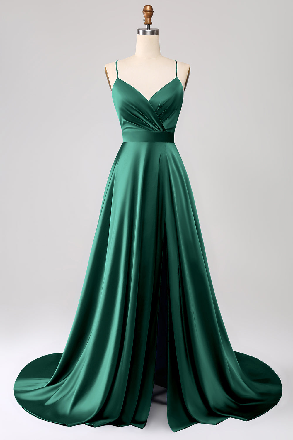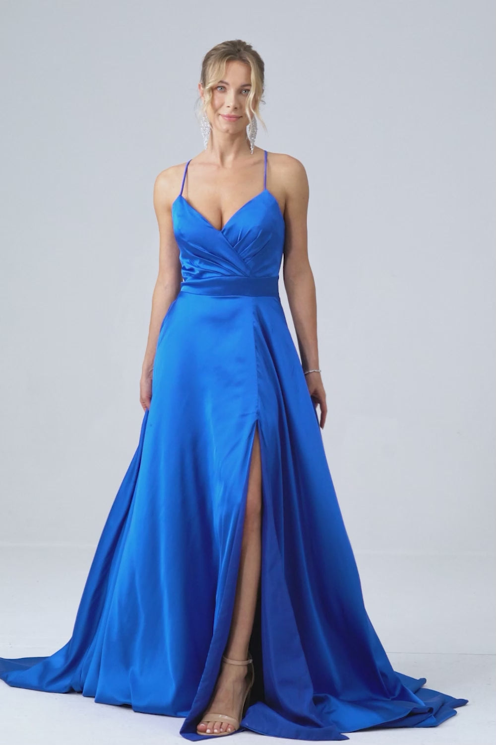 Royal Blue A Line Spaghetti Straps Satin Prom Dress with Slit