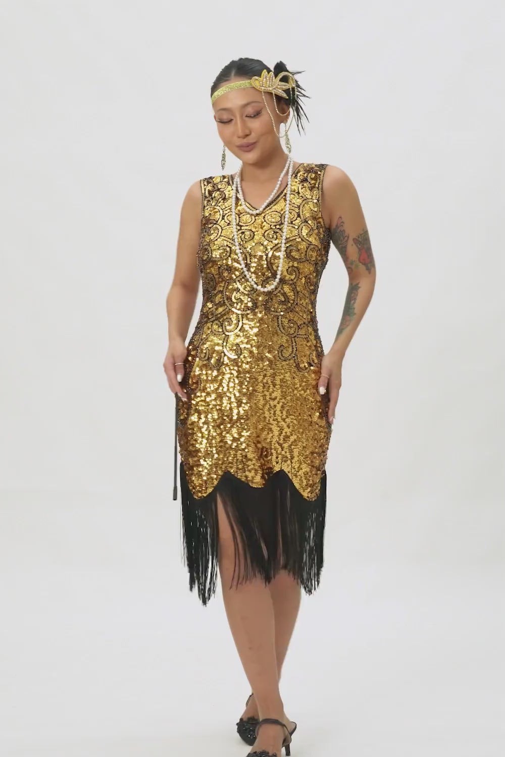 Sparkly Black Golden V Neck Bodycon 1920s Dress with Fringes