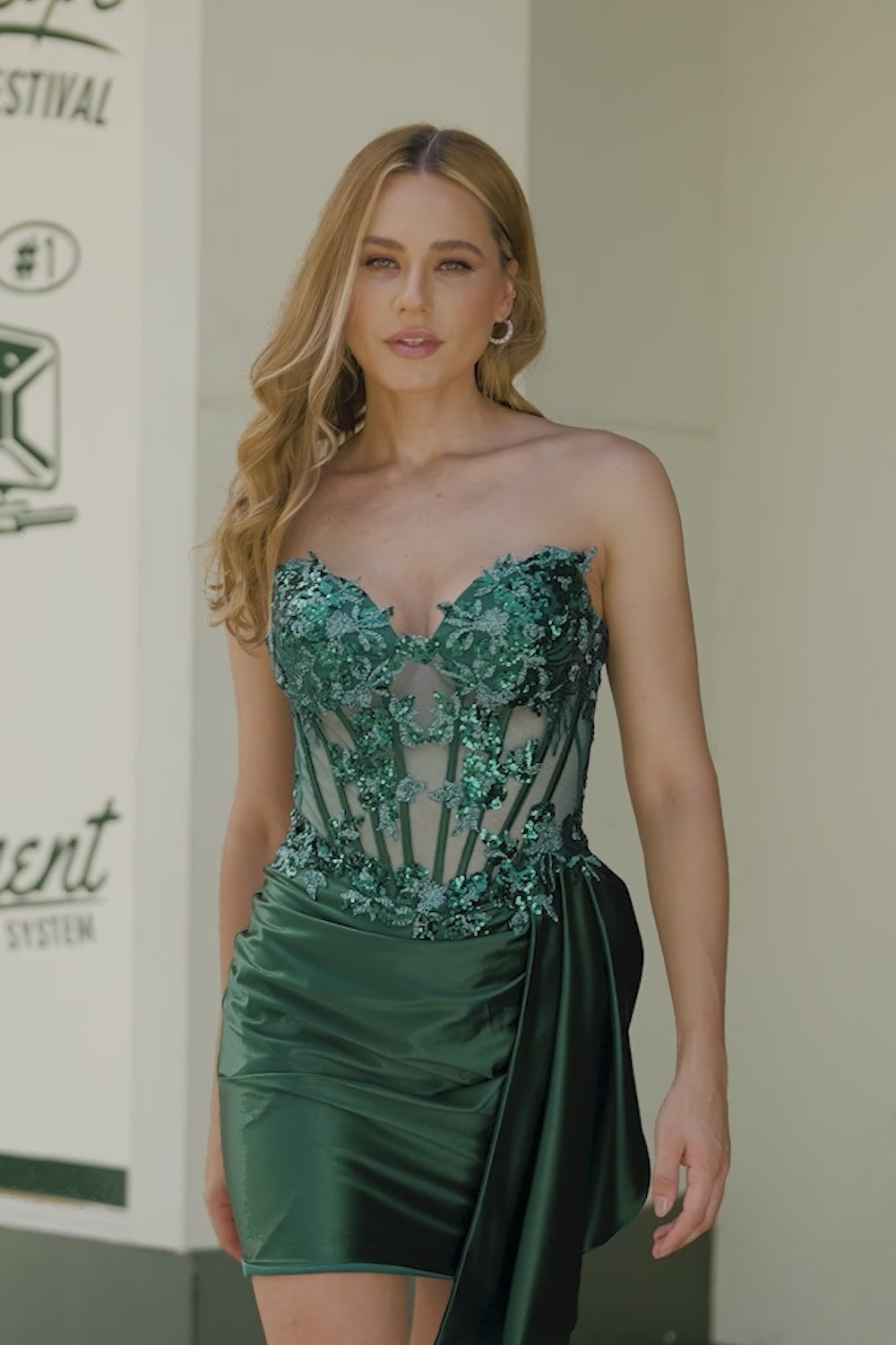 Sparkly Dark Green Strapless Corset Sequins Bodycon Graduation Dress with Streamer