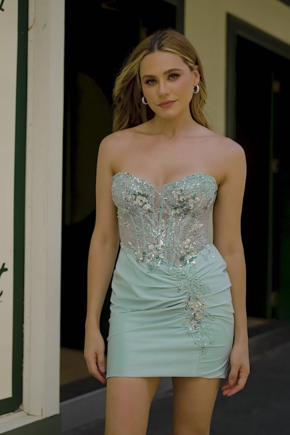 Sparkly Grey Green Bodycon Strapless Short Graduation Dress with Lace Up Back