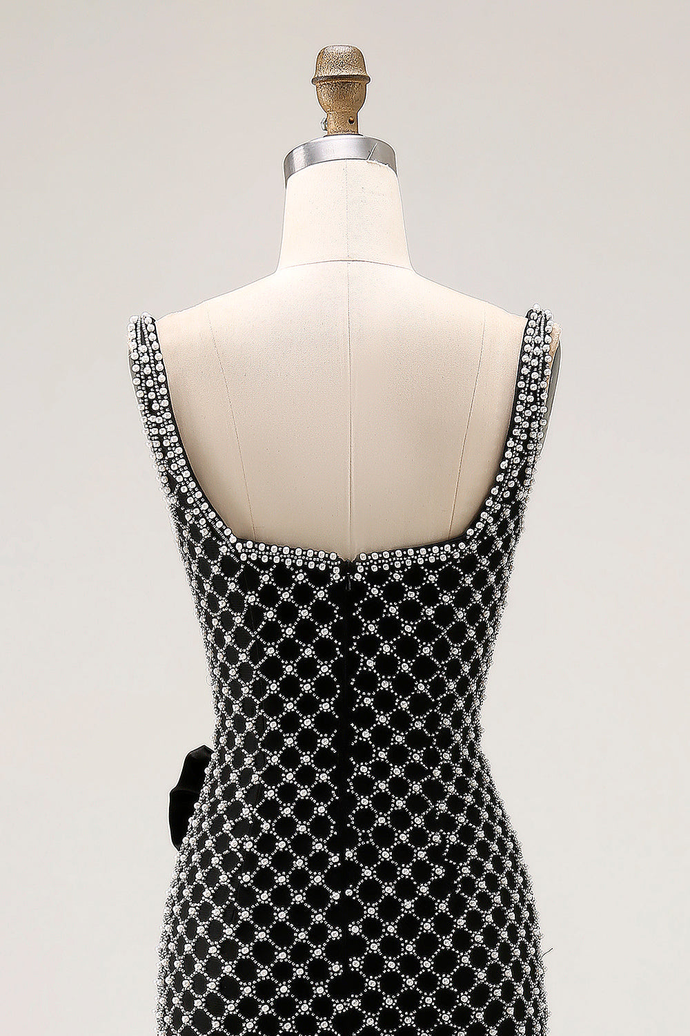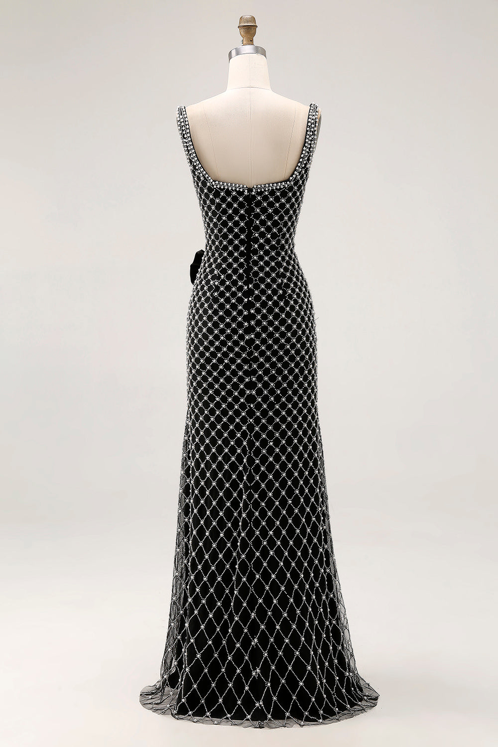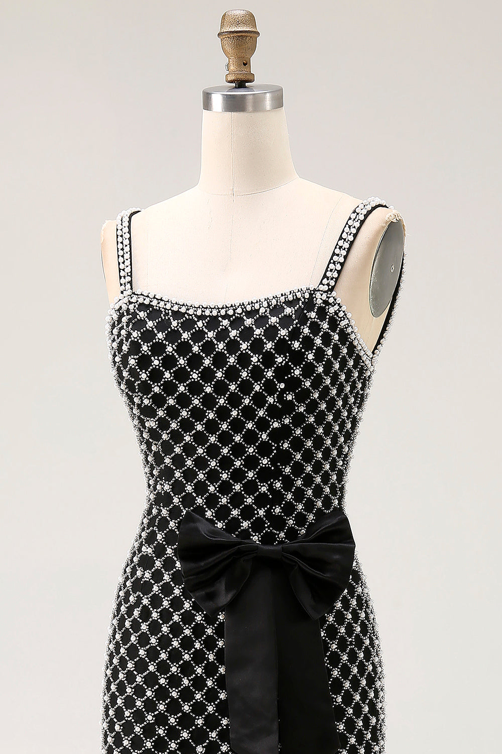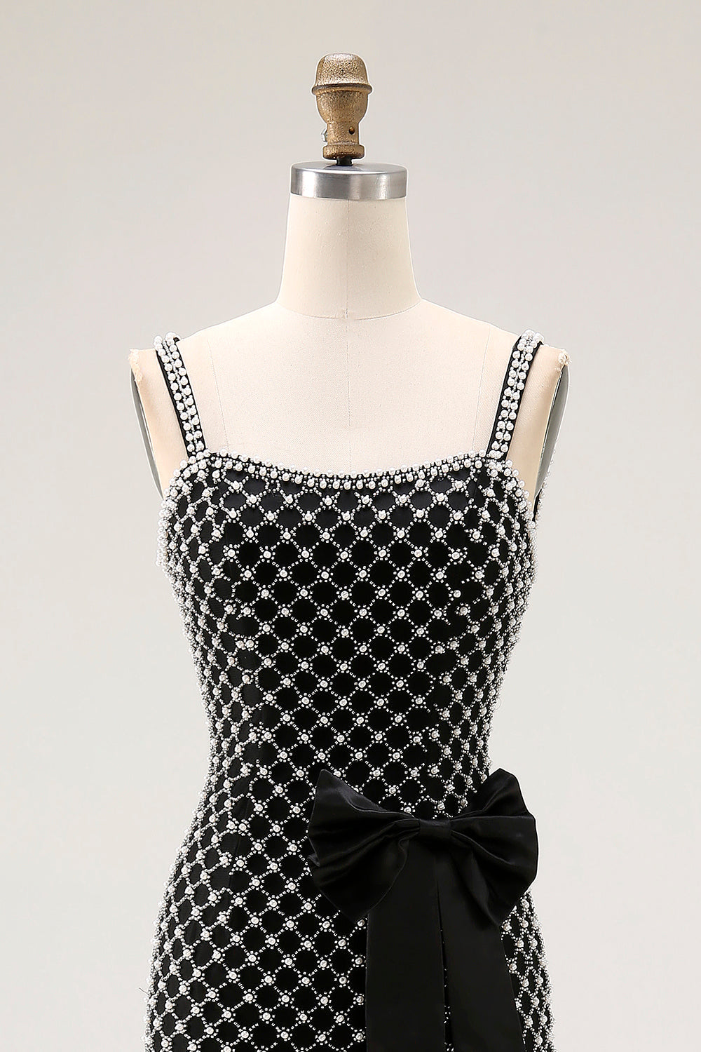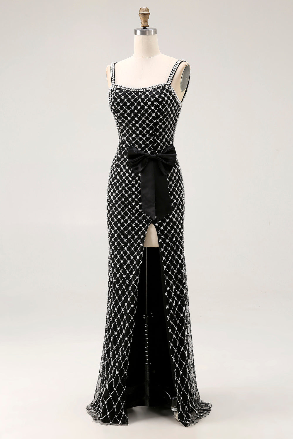 Black Beaded Mermaid Spaghetti Straps Pearl Side Bow Long Prom Dress with Slit