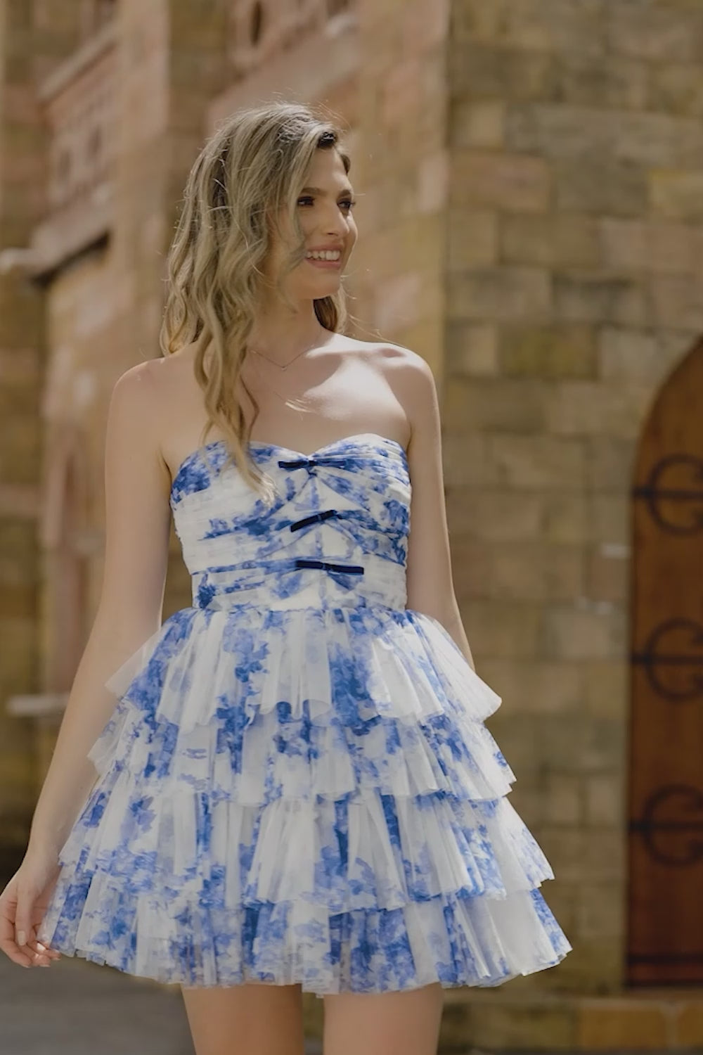 A Line Strapless Tiered Corset White Blue Flower Graduation Dress with Lace Up Back