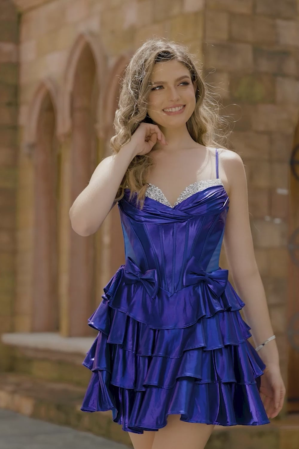 Metallic A Line Tiered Corset Short Graduation Dress with Bows