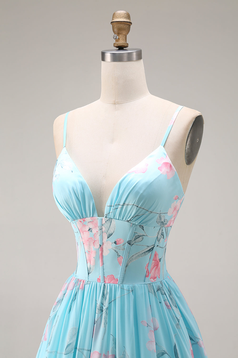 Blue Pink Flower A Line Ruffled Corset Spaghetti Straps Chiffon Long Prom Dress