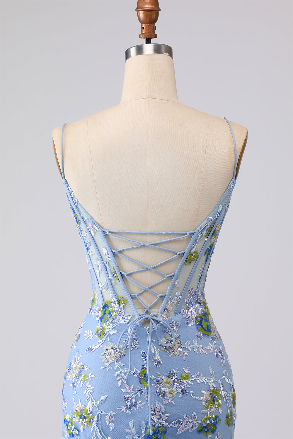 Blue Sheer Corset Mermaid Embroidered Long Prom Dress with Lace Up Open Back